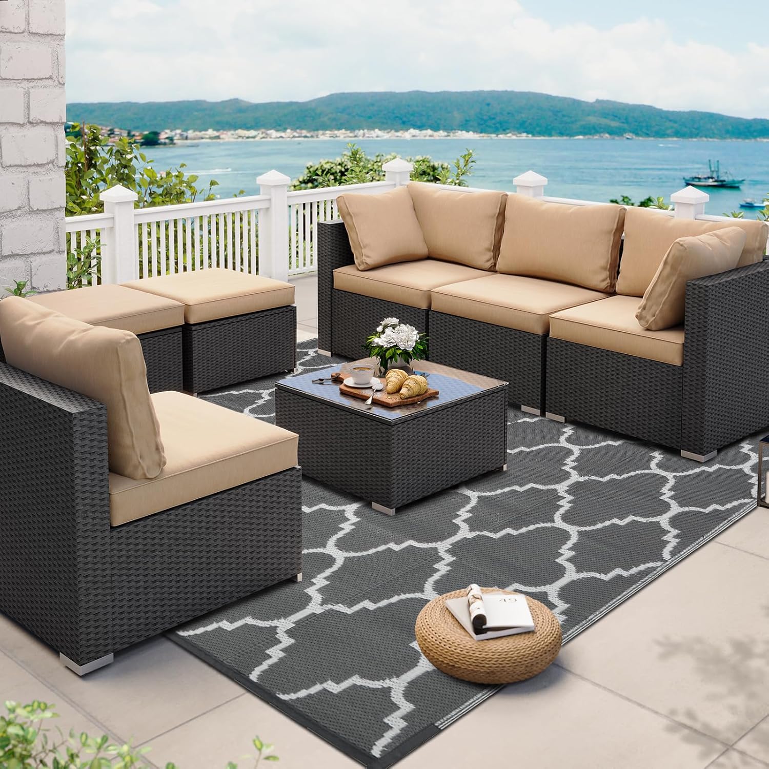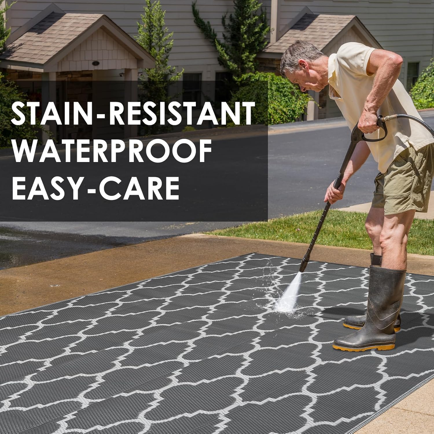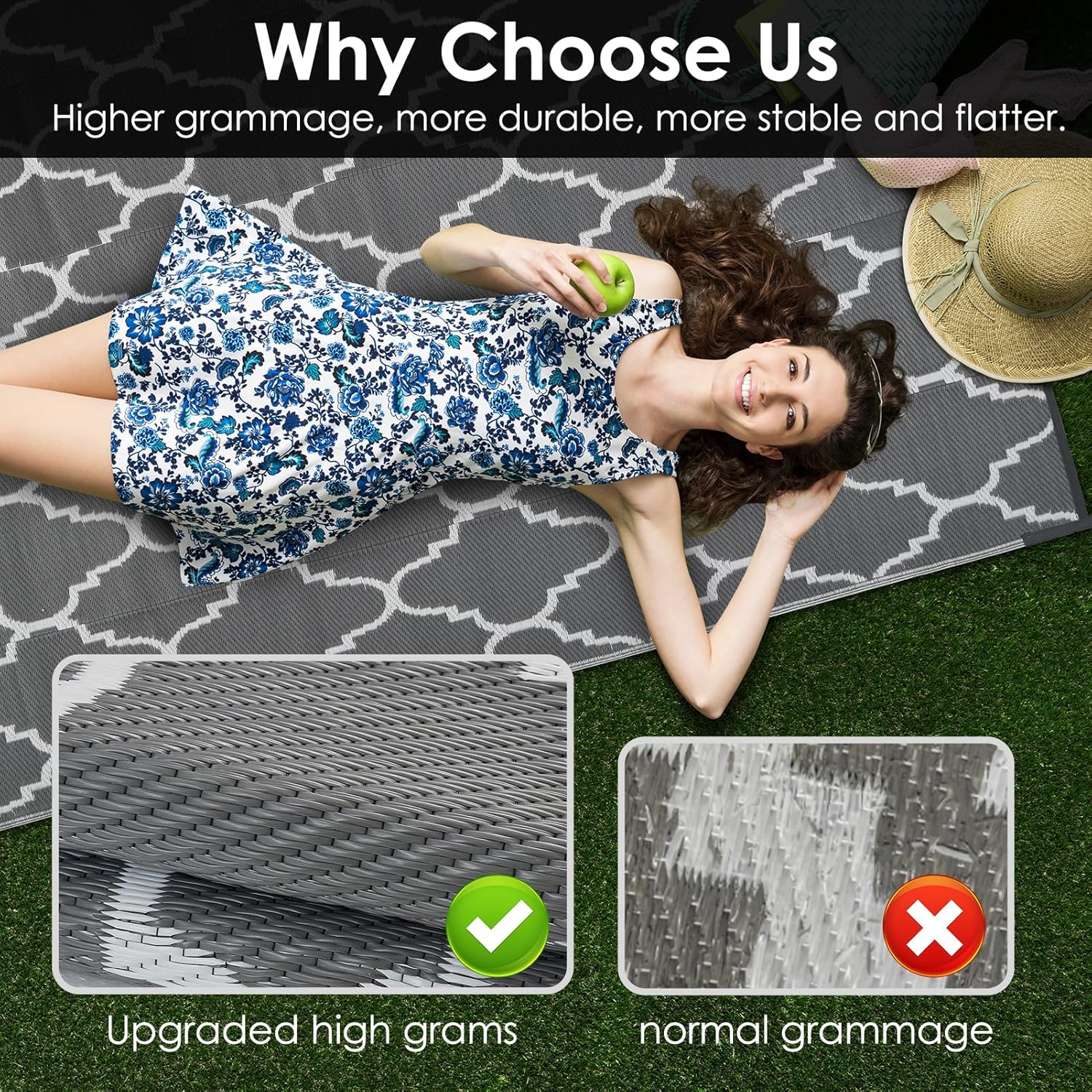 PREMIUM QUALITY MATERIAL: Outdoor patio rug is 100% recycled plastic tubes that are tightly woven to create an outdoor rug, thick and recyclable, sturdy and soft when walking barefoot. The outdoor rug is moisture-wicking and breathable, which can prevent children or pets from scratching the floor and protect your family’s safety.