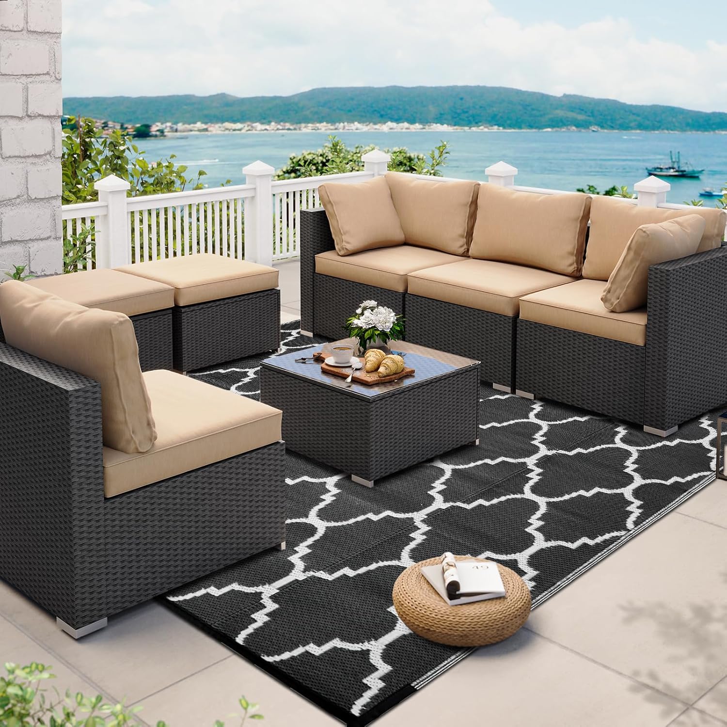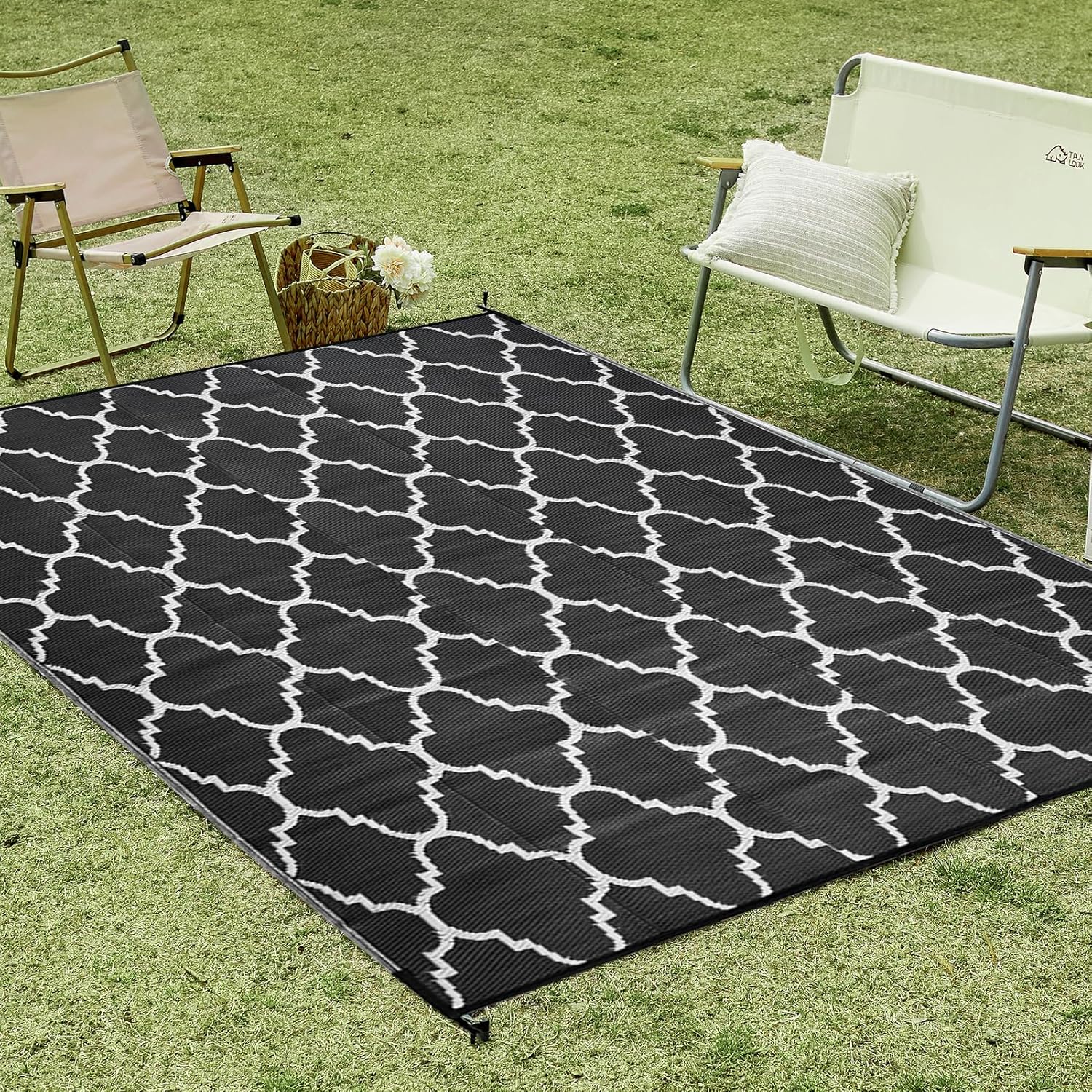 PREMIUM QUALITY MATERIAL: Outdoor patio rug is 100% recycled plastic tubes that are tightly woven to create an outdoor rug, thick and recyclable, sturdy and soft when walking barefoot. The outdoor rug is moisture-wicking and breathable, which can prevent children or pets from scratching the floor and protect your family’s safety.