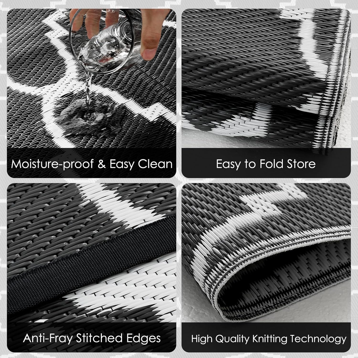 OIGAE Outdoor Rug – Weather & UV Resistant Black Rugs Reversible Large Rug 150X240CM Portable Anti-slip Plastic Carpet for Garden,Patios, Camping, Beach & Picnics Lightweight Waterproof Carpet Mats