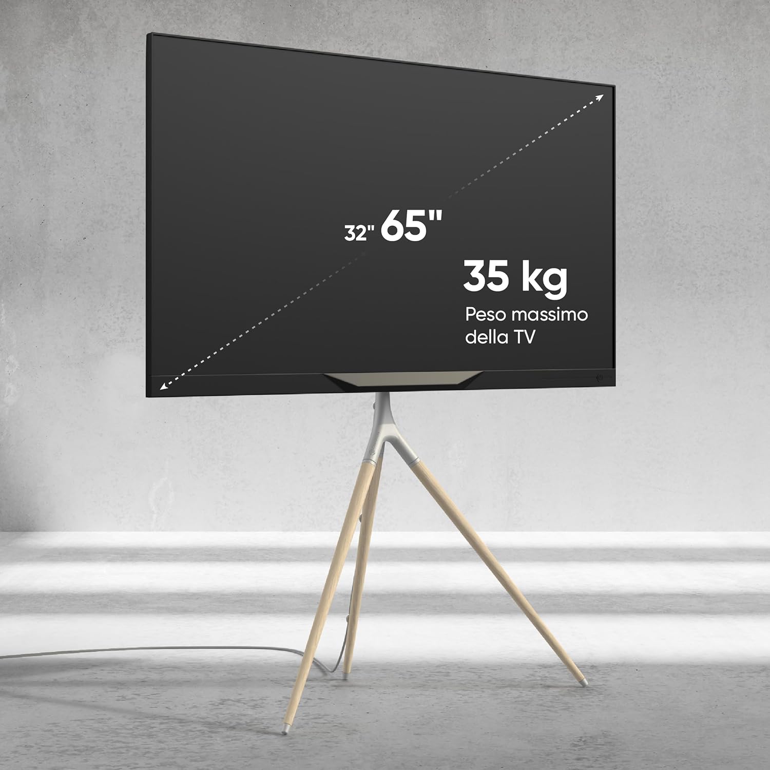 Fits most 32 – 65″ screens up to 35 kg, VESA100x100 – 400×400, solid wood legs, 360° swivel, tipover restraint for major security.