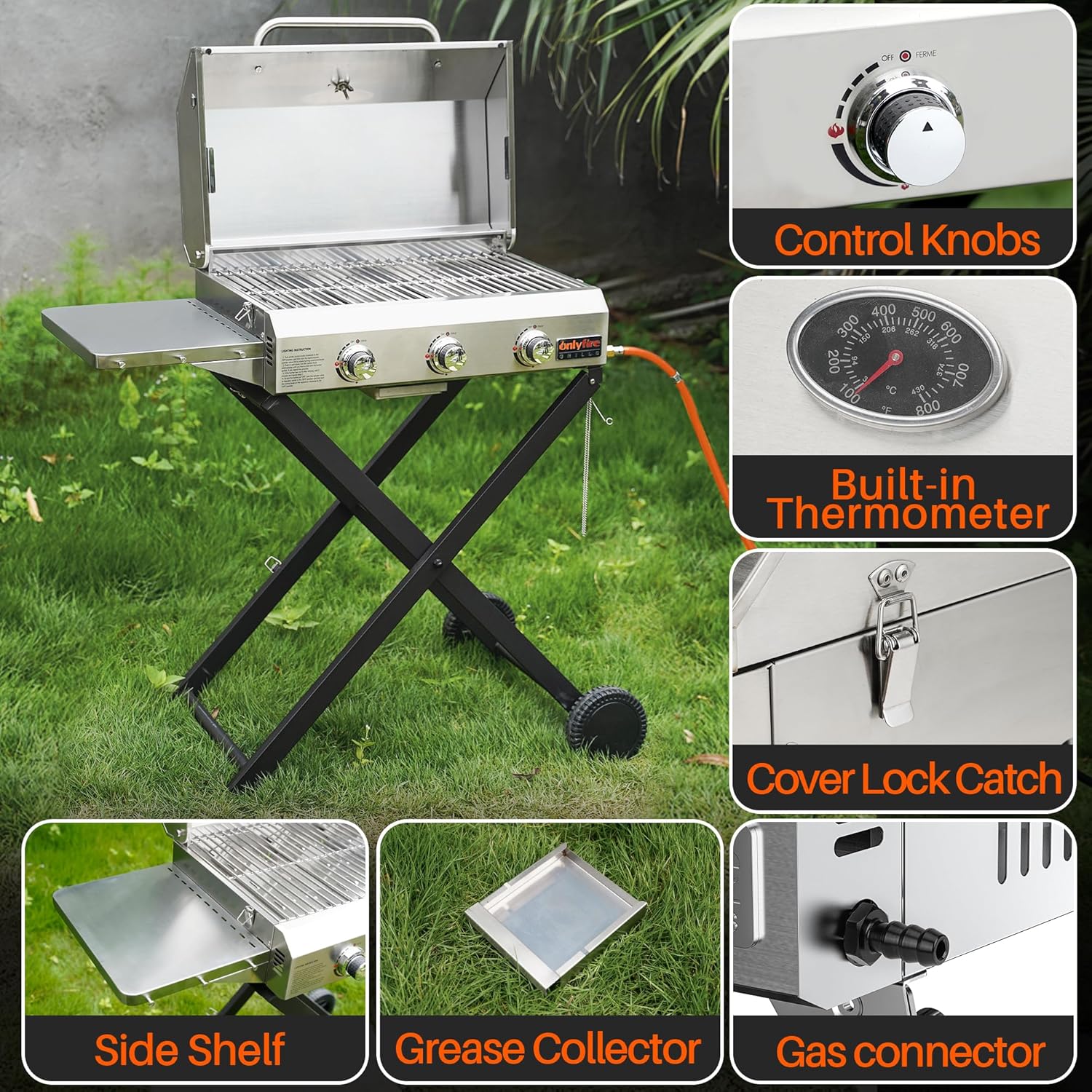 Onlyfire 3-Burner Portable Gas BBQ, Outdoor Gas Barbecue Grill 7KW Power with 22″ Cooking Grate, Thermometer, Side Table Shelf & Foldable Trolley, Stainless Steel