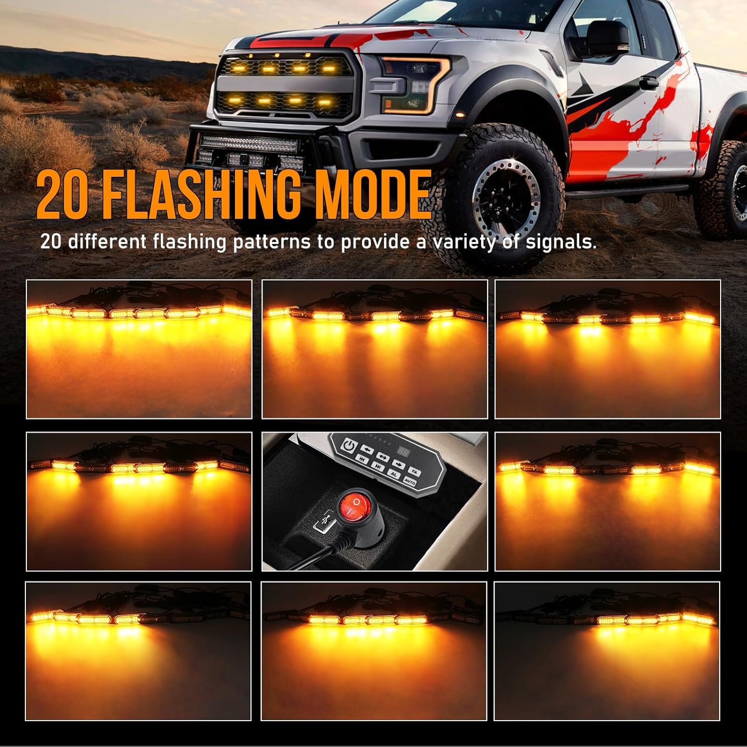 OPP ULITE Led Grille Strobe Lights Amber 9 Key Switch, 20-Flashing Mode, Surface Mount 12-LED Mini Warning Grill Light Bar for Construction Tow Trucks Van Utility Vehicle, 8pcs Pack