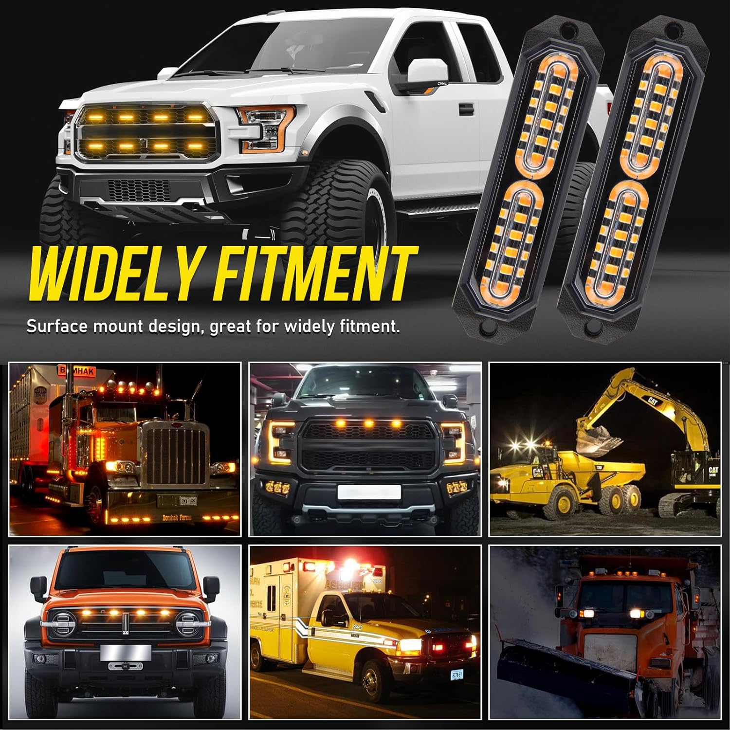 【Flush Mount Design Emergency Amber Strobe Lights】 For this amber led grille lights, it is surface mount design, which will be easy to install and great for postal car, tow truck, snow plow truck, construction vehicles, ram, tacoma, f150, f250, f350, f450 f550, pickups, trucks, vans, trailers, emergency service, safety warning etc.