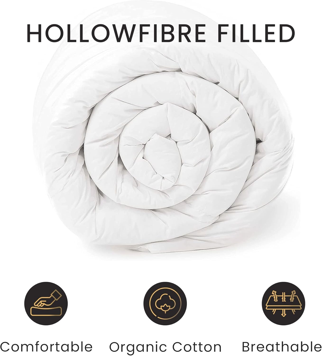 Experience the ultimate comfort during warm summer nights with Opulent Home 10.5 Tog Non-Allergenic All Season Duvet. Our lightweight and breathable duvet is designed to provide the perfect balance of warmth and comfort, ensuring a restful and peaceful sleep. Our anti-allergy duvet is made from pure cotton fabric with hollowfibre filling, this duvet is non-allergenic and ideal for people with sensitive skin. The high-quality materials used in its construction ensure durability and longevity. Its aesthetically pleasing design and premium quality make it a perfect addition to your bedding collection.
