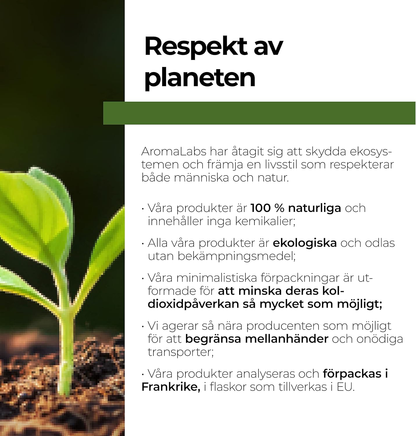 AROMALABS COMMITMENTS: All our essential oils are subjected to a chromatographic analysis. It means that their biochemical composition is rigorously controlled to ensure that each essential oil is 100% pure and that it contains all the molecules necessary for its therapeutic effectiveness. We work with local producers when it’s possible, and we manufacture in France. Our essential oils come in a recylced cardboard box.