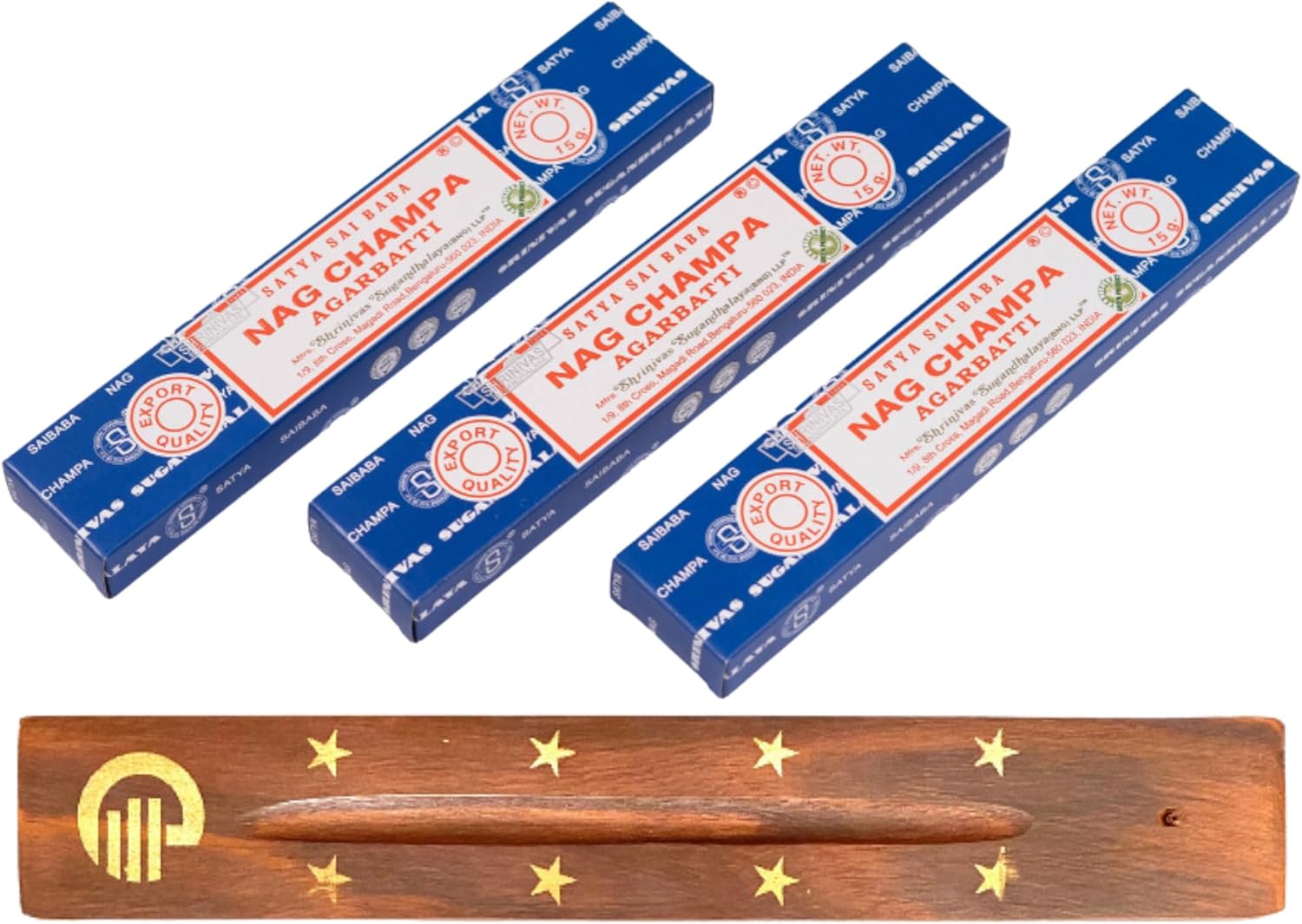 Original Satya Nagchampa Agarbatti Incense Sticks Pack of 3X 15G with Greensense Holder for Aromatherapy, Spa, Yoga, Weddings, Meditation, Healing, Positivity and Relaxation