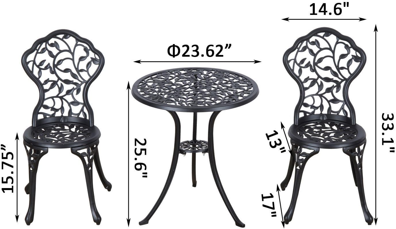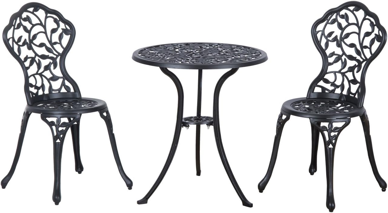 (as of [price_update_date] – DetailsThis Outsunny outdoor bistro set is a great addition to any garden or patio, made with cast aluminum, and finished with a leaf design. The set comes complete with two chairs and a table ideal for any garden. This set is designed with the ability to be also used in balconies and porches with limited space. A great inviting piece of furniture for any garden, patio and more. Features: intricate 3 piece outdoor patio bistro dining set completes any outdoor setting with style solid, rust-resistant cast aluminum construction in an elegant design to complement your existing style or create a whole new look comfortable and lightweight enough to use anywhere yet sturdy and durable for an outdoor environment 2 chairs and 1 table are included making it ideal for backyards, patios, porches, balcony, gardens and more can be easily coupled with our other Outsunny table and chairs for additional seating options specification: colour: Black material: cast aluminum table dimension: φ60 x 65H (cm) chair dimension: 37Wx 43D x 84H (cm) Net weight: 12.5kg table max. Load: 50kg chair max. Load: 150kg custom label: 84B-028