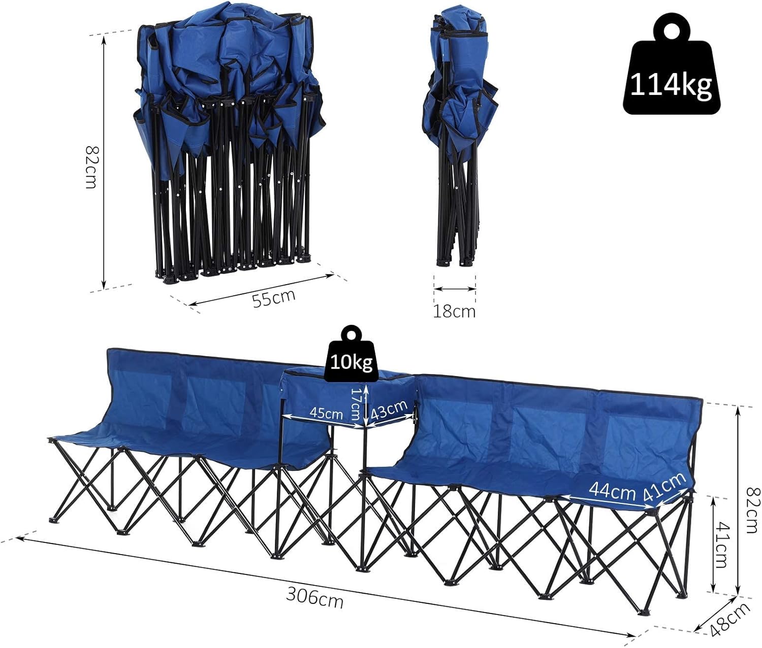 FOLDABLE CHAIR DIMENSIONS: 82H x 306L x 48Dcm. Per seat: 41D x 44Wcm. Cooler box: 20H x 45L x 43Wcm. Folded: 76H x 55L x 18Wcm.