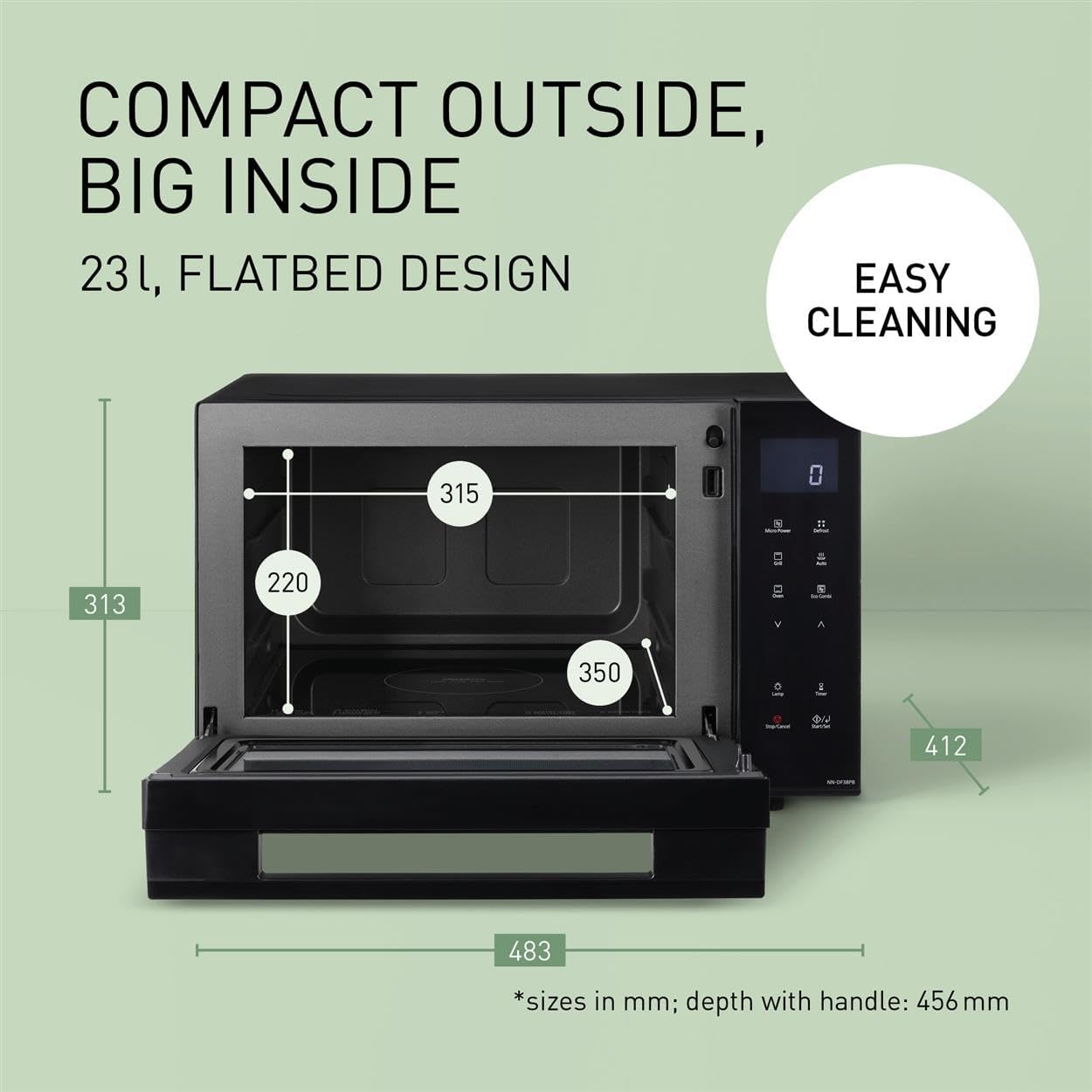 COMPACT DESIGN: This microwave oven’s large 23L capacity is ideal for big dishes, while its drop-down door and flatbed, slimline design make it perfect for small kitchens with limited space.