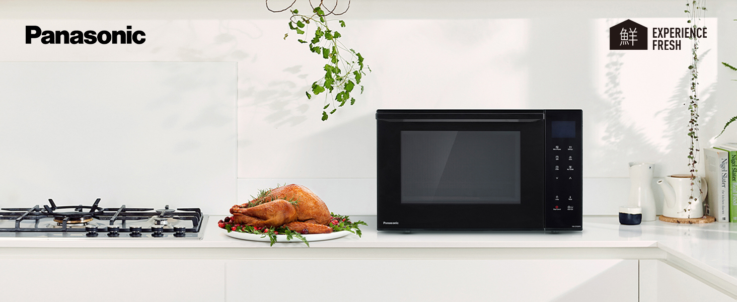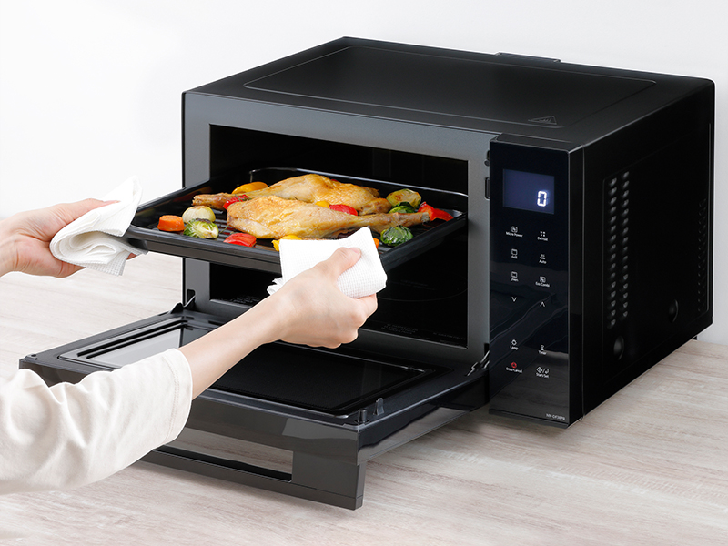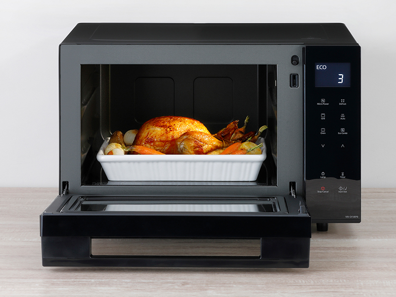 Perfect for smaller kitchens with limited countertop space: the NN-DF38 is extremely compact in size while giving you a large cooking space that fits even a whole chicken! The slim width frees up countertop space in front for taking care of little things – while the pull-down door gives you more setup flexibility. Because it has no turntable, you can easily use the included enamel tray or even rectangular cookware.