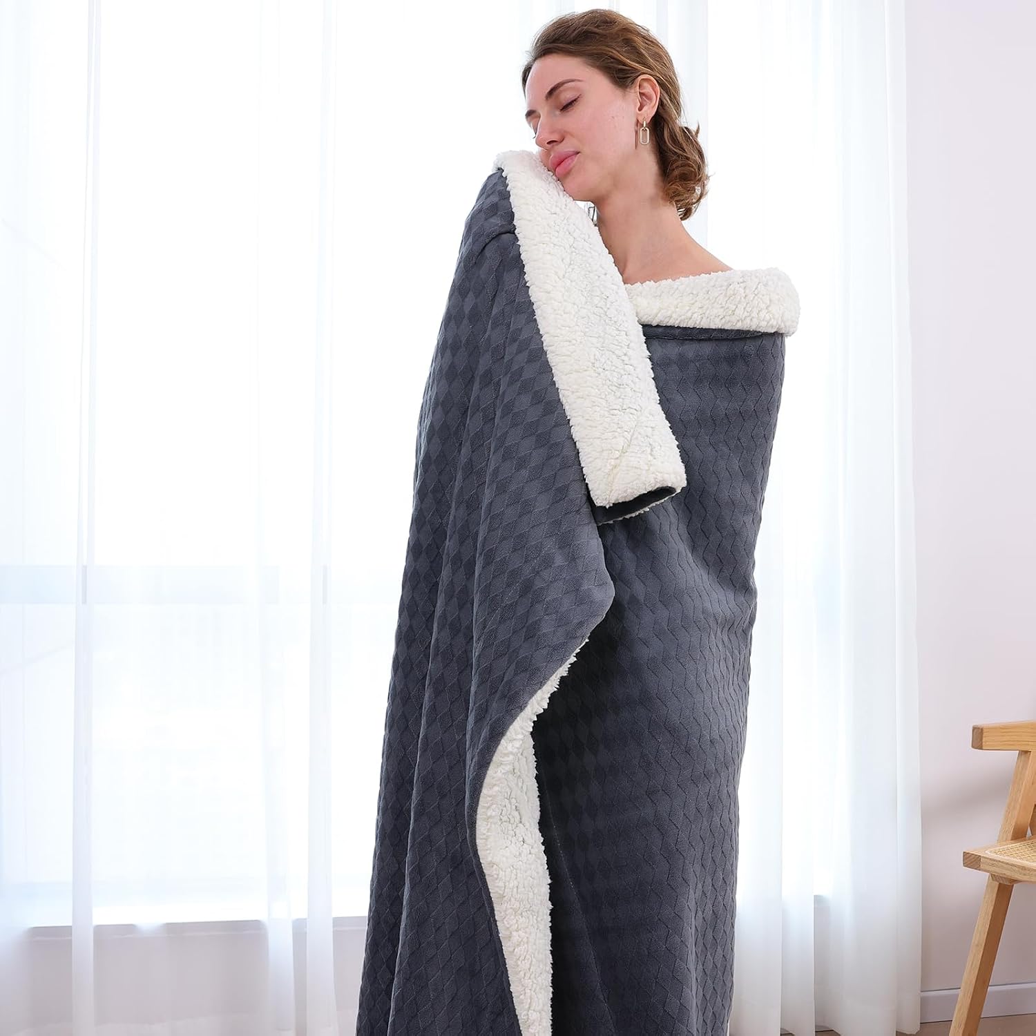PanxHome Sherpa Fleece Blanket 200×230 cm, Unique Rhombus Jacquard Milk Velvet Blanket, 470GSM Warm and Fluffy Blanket, Soft Blanket for Bed Queen Size, Sofa Throw, Anti-Static Blanket, Dark Grey