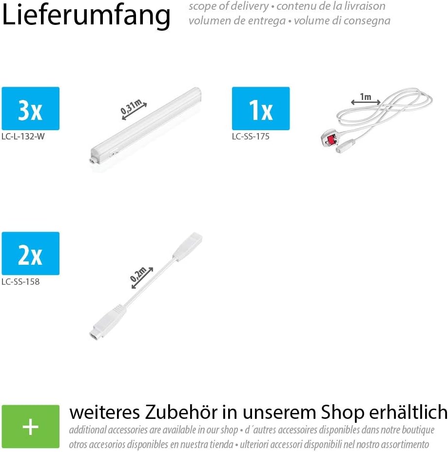 3 x RIGEL under-cabinet light – LC-L-132-W (6 x fixing clip, 6 x screw), 1 x mains cable – LC-SS-175, 2 x feed-through cable – LC-SS-158