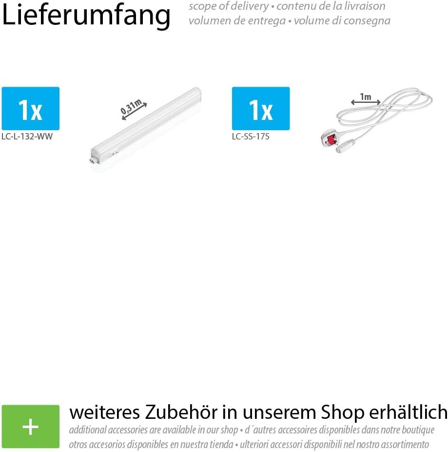 1 x RIGEL under-cabinet light – LC-L-132-WW (2 x fixing clip, 2 x screw), 1 x mains cable – LC-SS-175