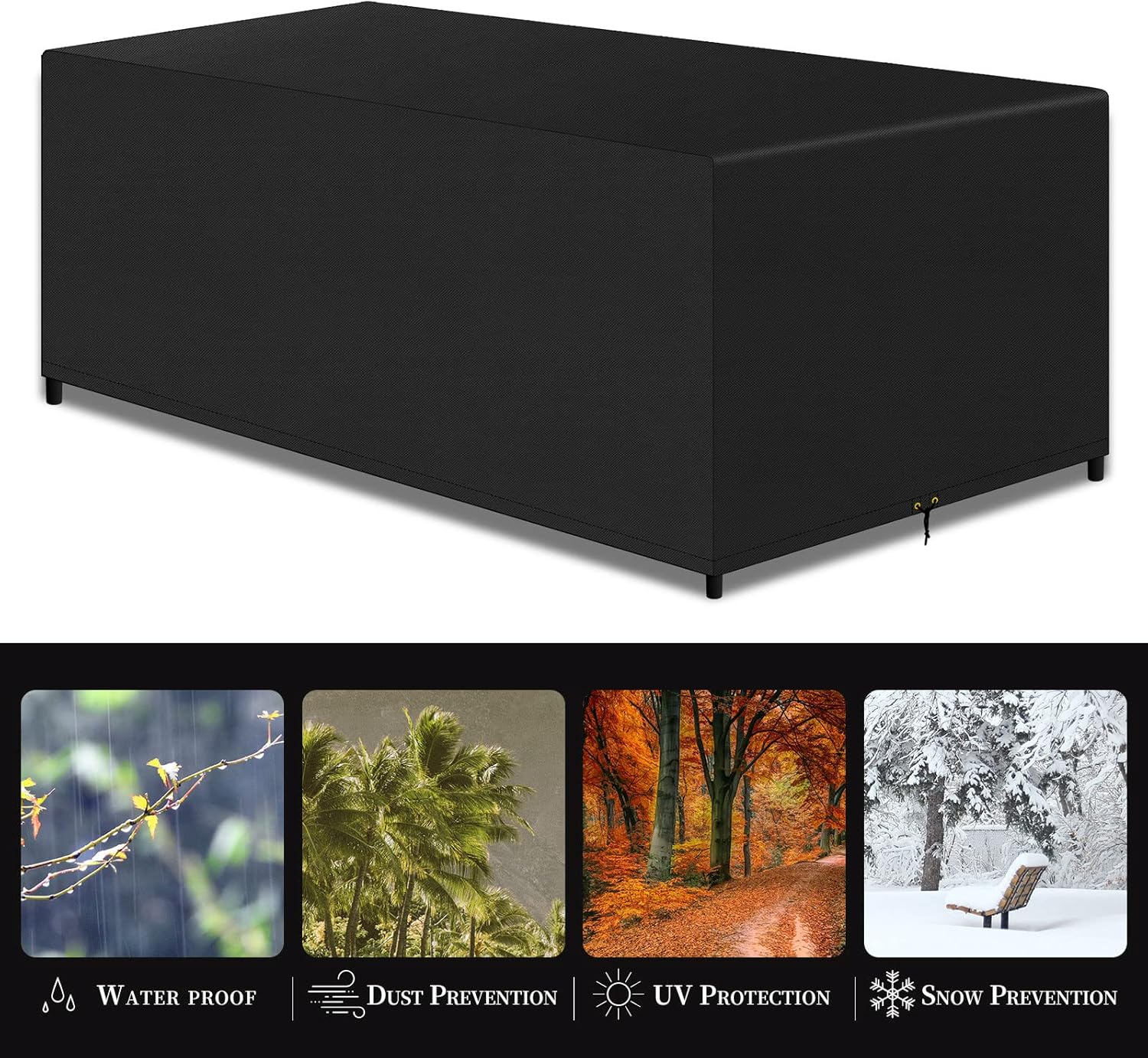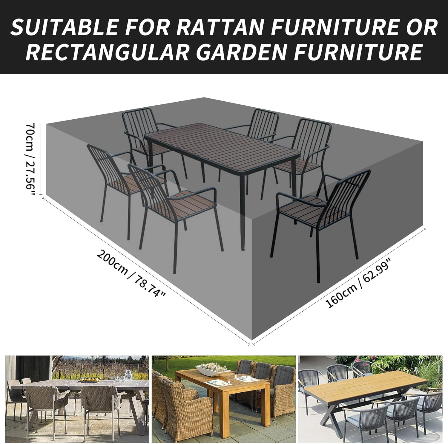 👉【UNIVERSAL DIMENSIONS】The size of this patio table cover is 200x160x70CM. This Rectangular patio set cover suitable for patio table with 4 seats.Check the dimensions of your furniture and equipment to make sure it fits.