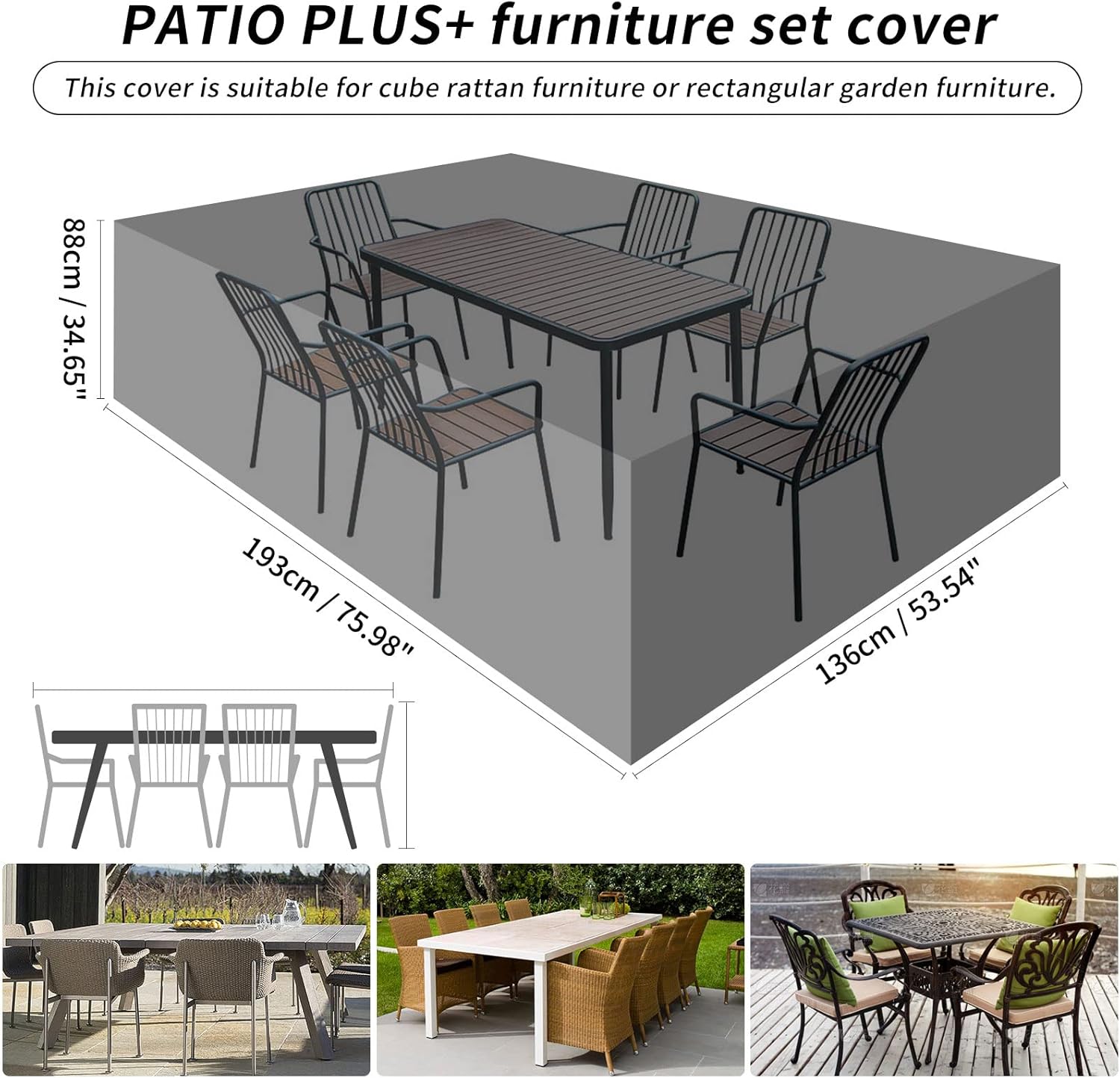 👉【UNIVERSAL DIMENSIONS】The size of this furniture cover is 193x136x88CM. This rectangular patio set cover suitable for large patio table with 8 seats. This cover is also suitable for rattan furniture or oval shaped garden furniture.