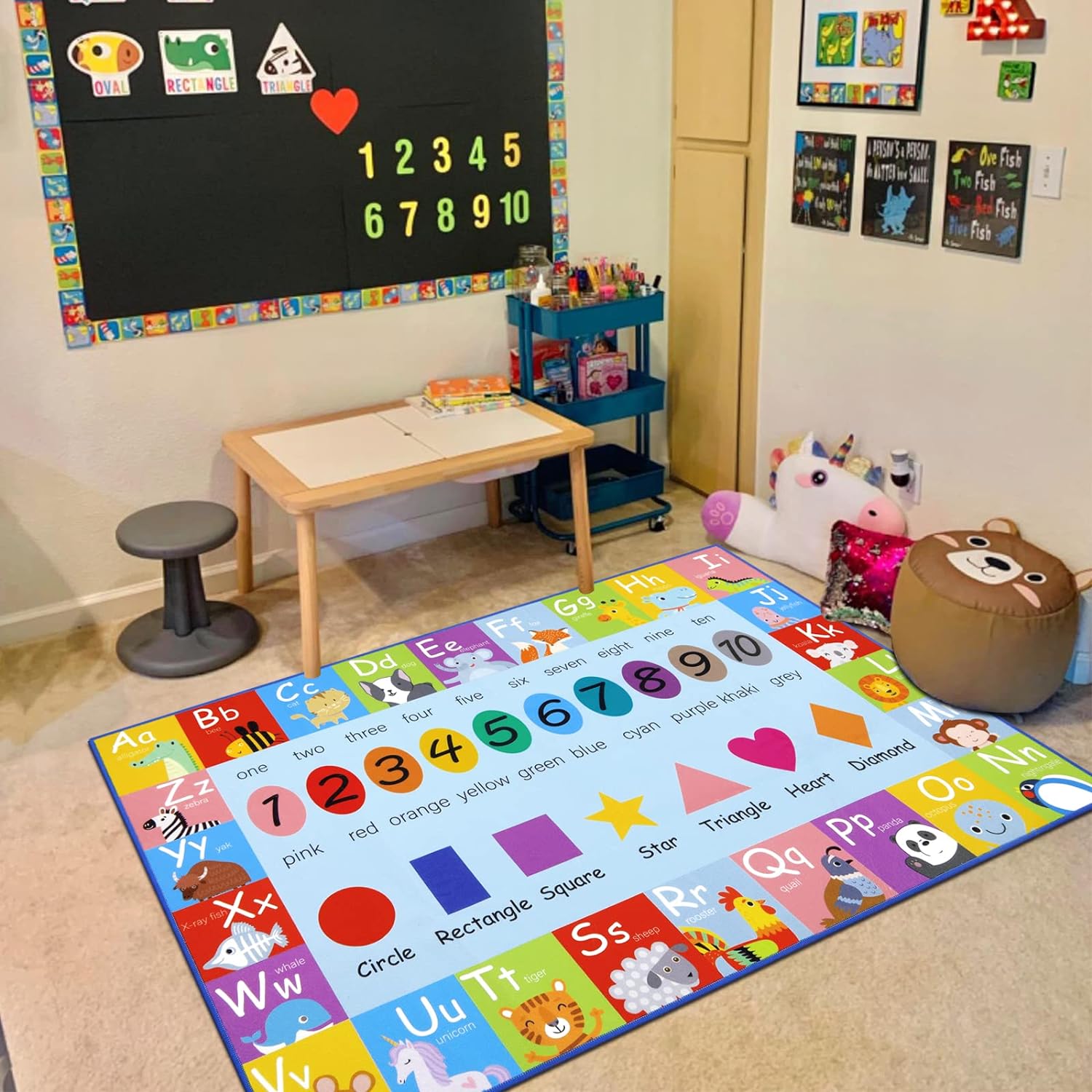 Educational Children Mat: Our kid educational rug comes with ABC Alphabet, Numbers, Shapes,Animal and Color. Let your child learning through playtime, With cute and interesting cartoon patterns and bright vivid colors inspire the curiosity in your baby’s heart and promote early education.