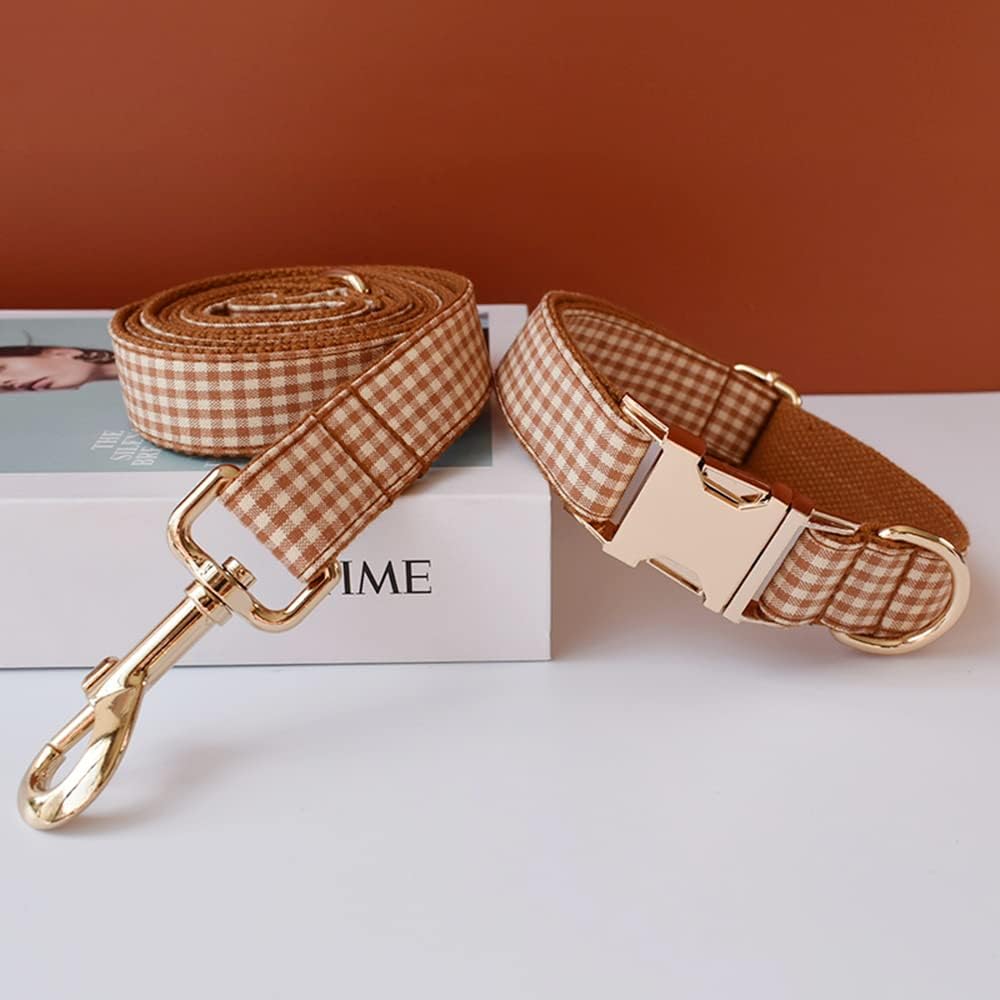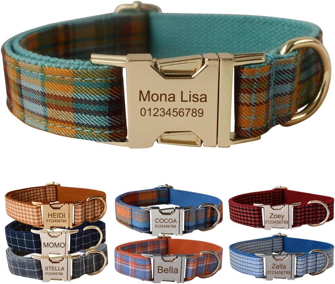 Personalised Dog Collar with Metal Buckle, Customized Pet Collars with Name Phone Number Address Engraved, Plaid