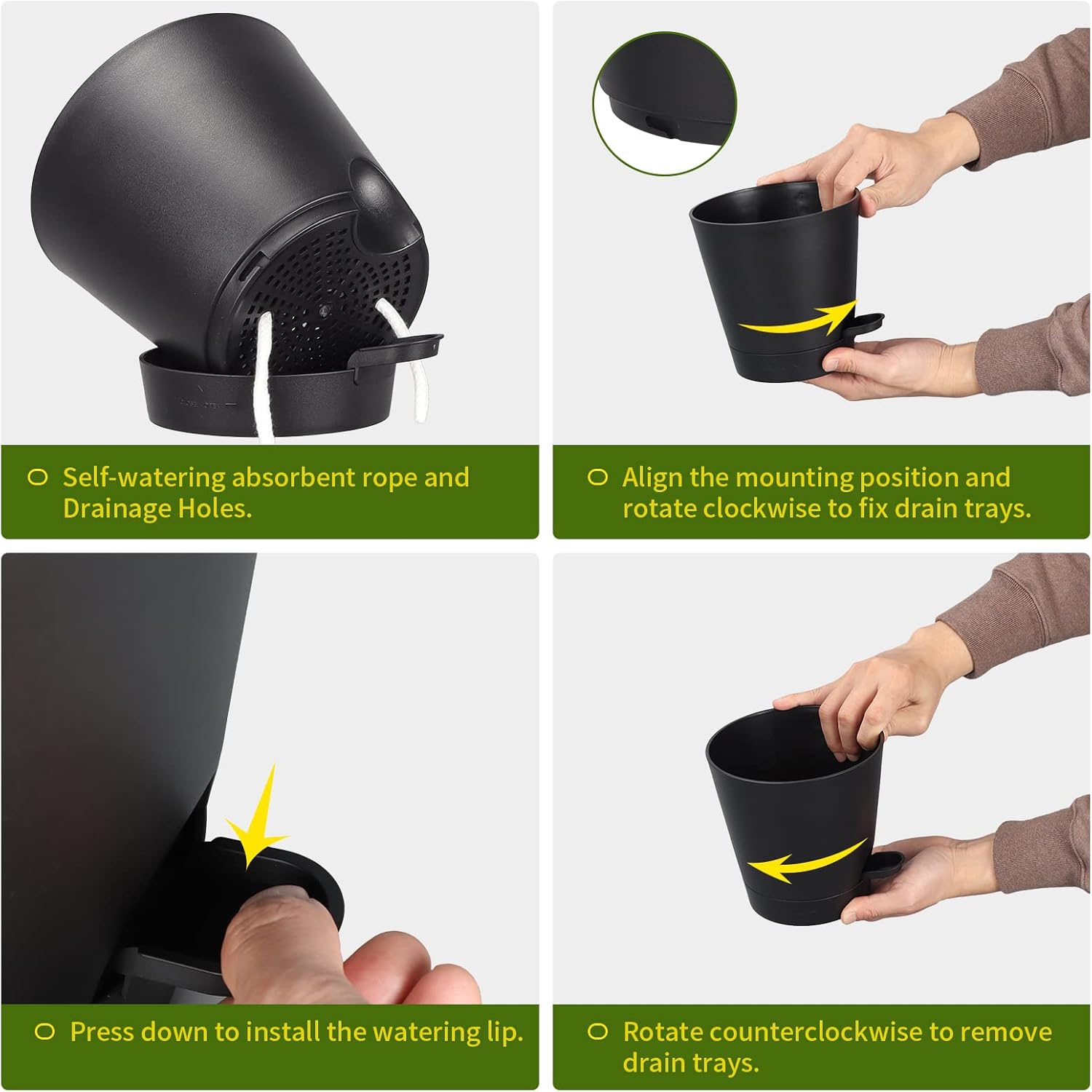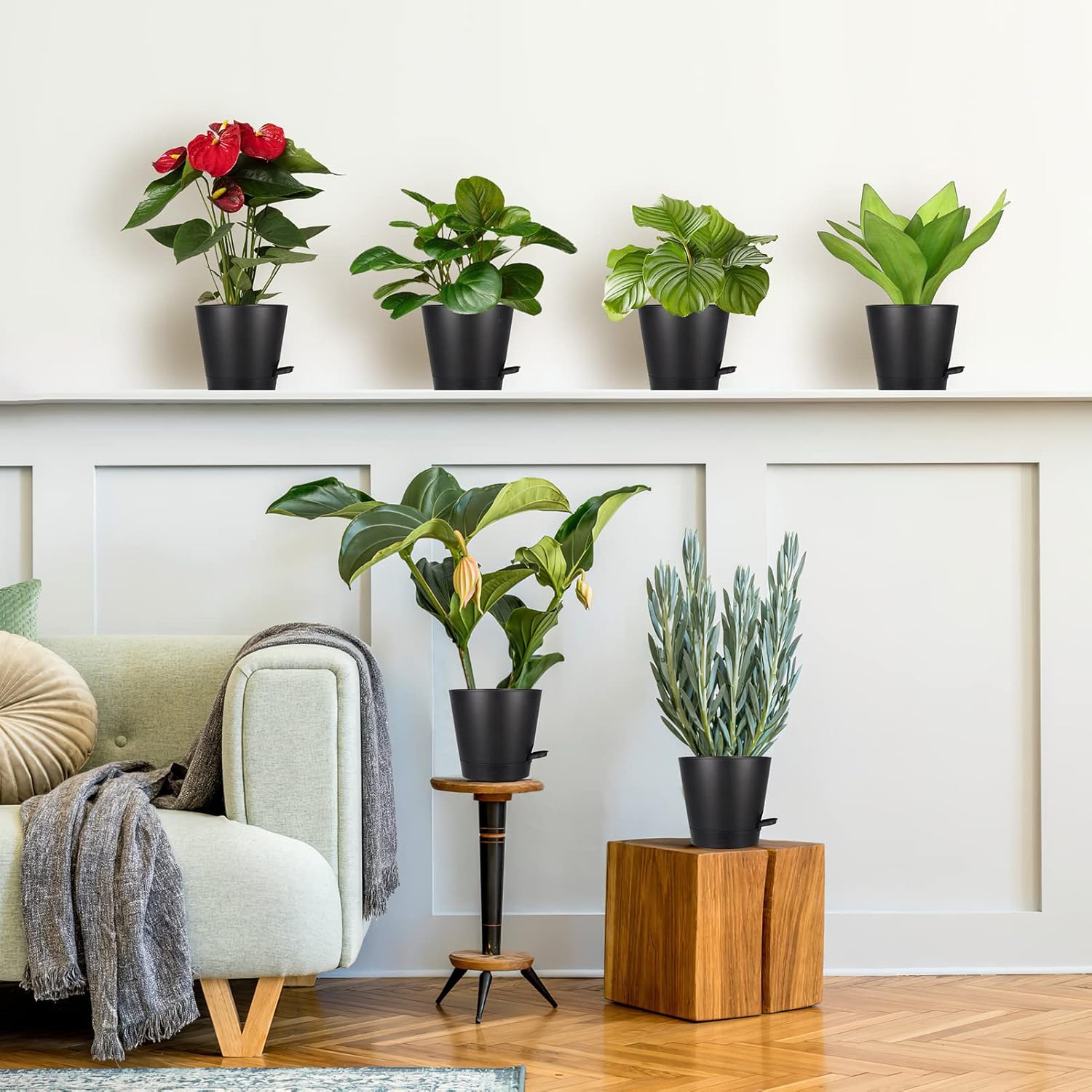 PETAFLOP Plastic Plant Pots Indoor, 6 Pack 6 Inch/15cm Self Watering Plant Pot with Drainage Hole, Saucers, Absorbent Rope and Watering Lip for House Plants, Black