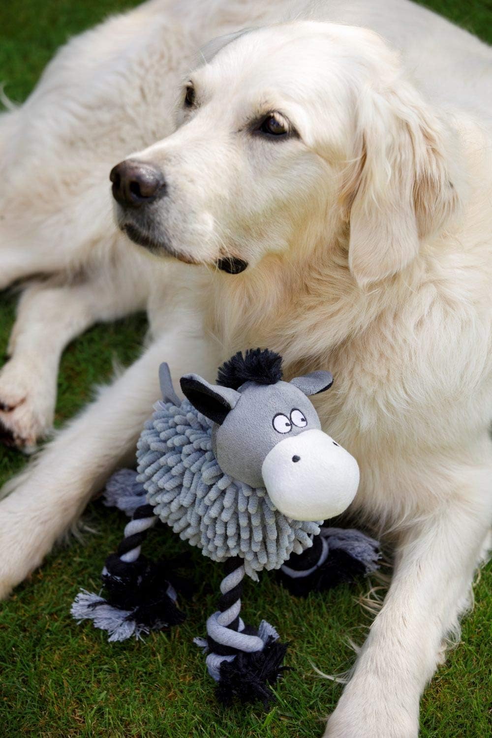 A Beautiful, soft textured plush toy, with built in squeaker and rope cord legs to provide your dog hours of entertainment.