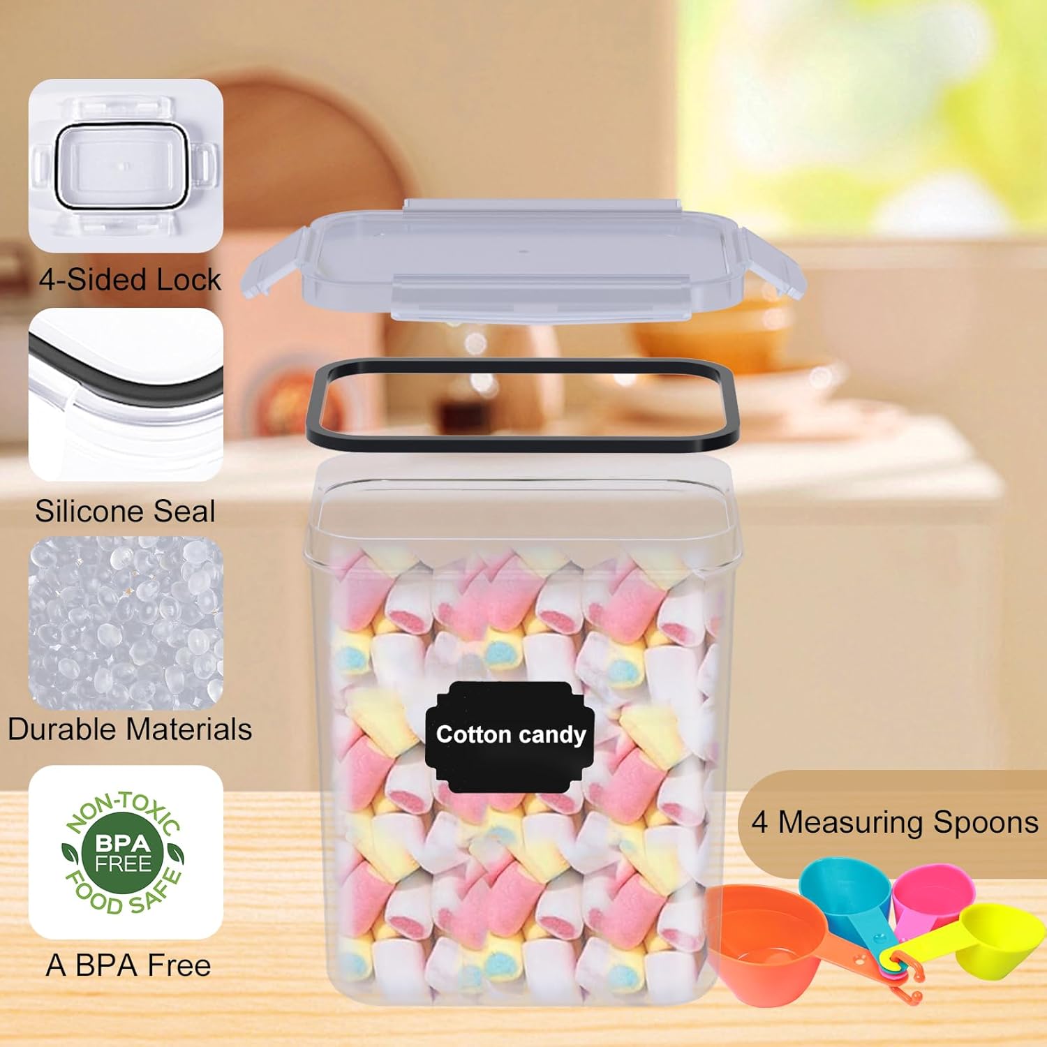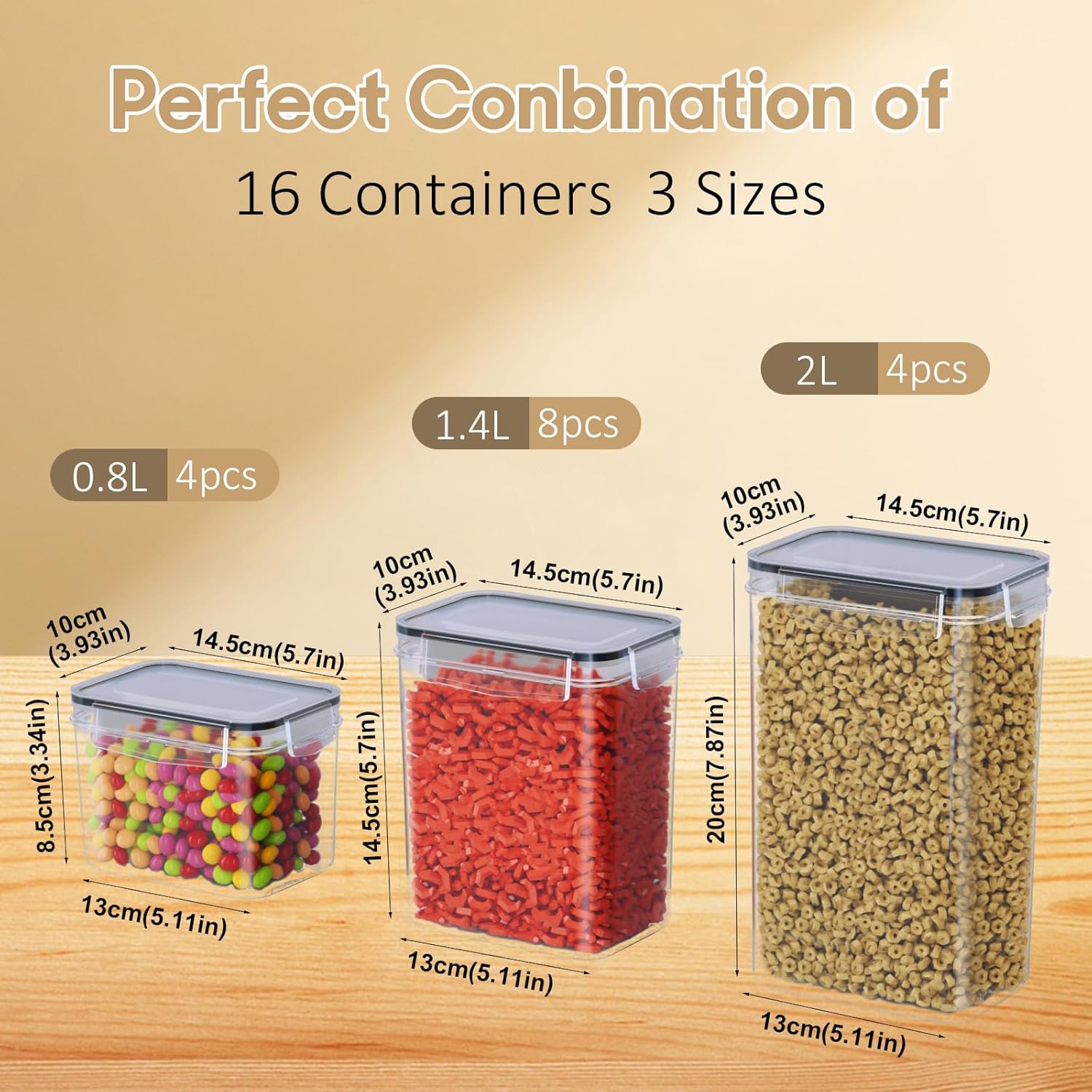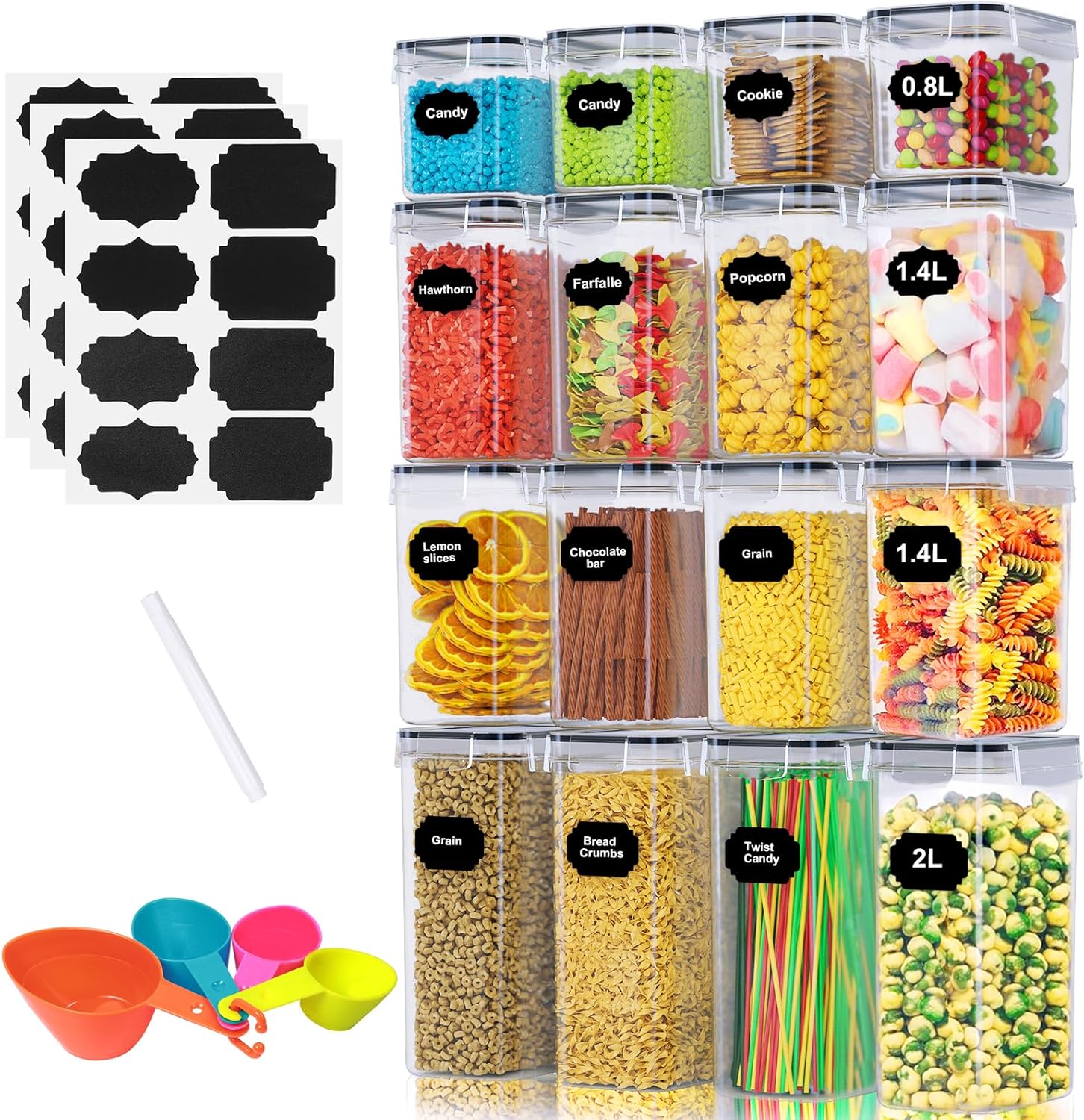 Peyiuun 16Pcs Airtight Food Storage Containers & Kitchen Storage Containers with Lids 2/1.4/0.8L Plastic Cereal Storage Containers with Labels Marker Spoon Set, BPA-Free, for Dry Food, Flour, Sugar