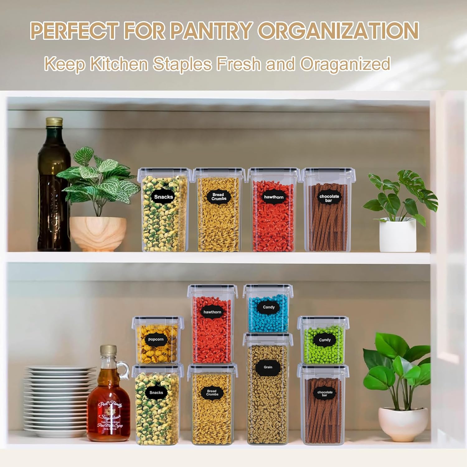 Thanks to the stackable design, these pantry storage containers can be used more efficiently to utilise every inch of your kitchen and pantry. They are easy to stack when filled, and also stackable when empty. So you can organise your pantry like never before.Cereal container set of 16 comes with 24 label stickers and an erasable marker; 4 measuring spoons, the labels will help you never confuse flour with powdered sugar or baking powder with baking soda. They are reusable and you can switch contents whenever you need.