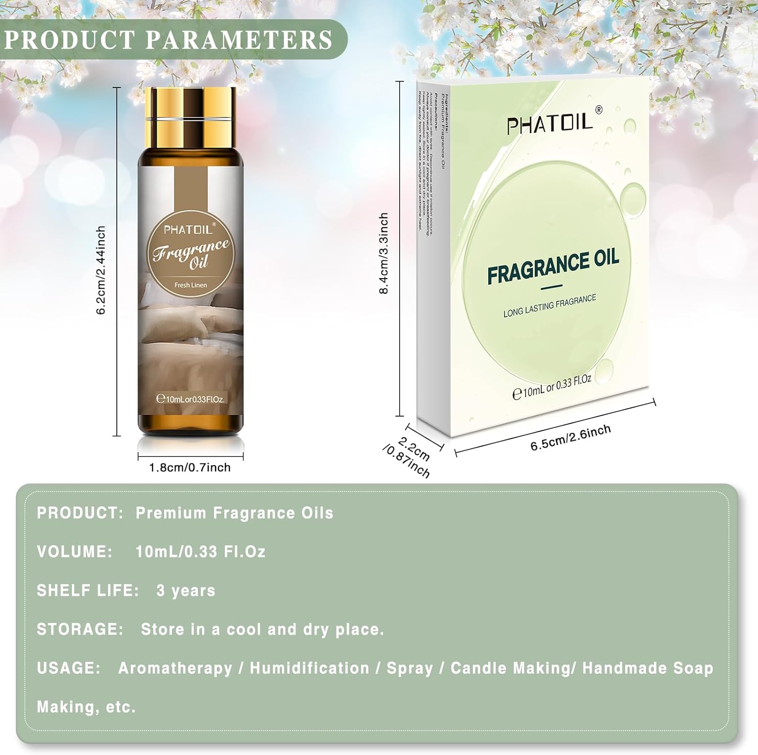 Superior Glass Bottle with Included Dropper: Our PHATOIL Fresh Linen Fragrance Oil comes in a premium glass bottle that ensures the integrity of the oil is preserved. The included dropper allows for easy and precise dispensing, preventing spills and waste.