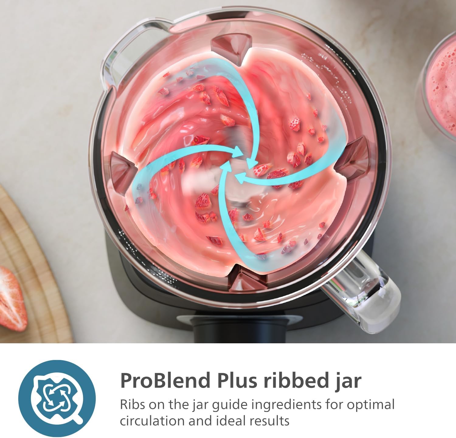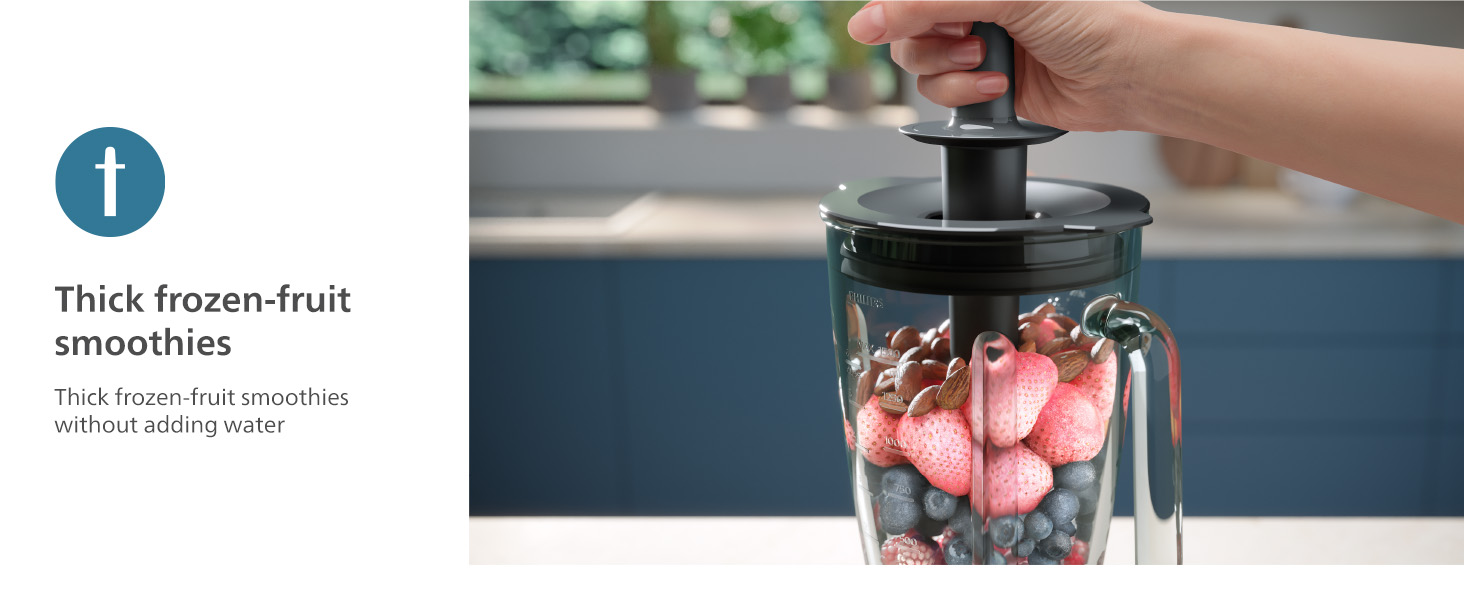 Effortless Smoothies: Enjoy velvety and thick-frozen smoothies effortlessly without adding water with the Philips 5000 Series Blender, featuring ProBlend Plus technology for 50% more power (1)