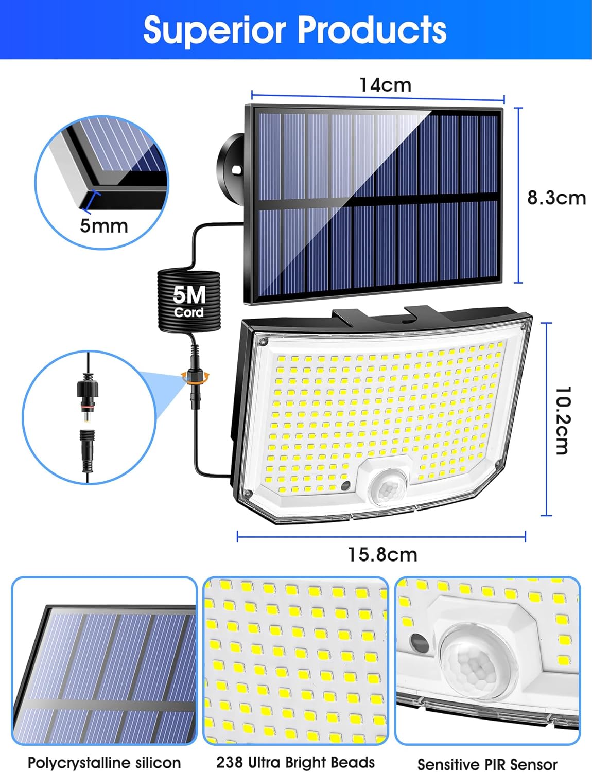 【Split Solar Panel & Easy to Install 】Compared to traditional solar lights outdoor garden solar lights,our solar panels and lights have a unique split design,connected by a 5M long cable. Split solar garden lights solar powered waterproof have more choices of mounting locations and solar lights outdoor garden solar lights can be charged and work properly even in rainy season or winter. Garden lights solar powered waterproof solar lights outdoor garden solar lights are easy to install and can be mounted with the provided screws.Solar security lights outdoor motion sensor solar garden lights solar powered waterproof can be screw mounted to the wall,perfect for patios,lawns,yards,front doors.