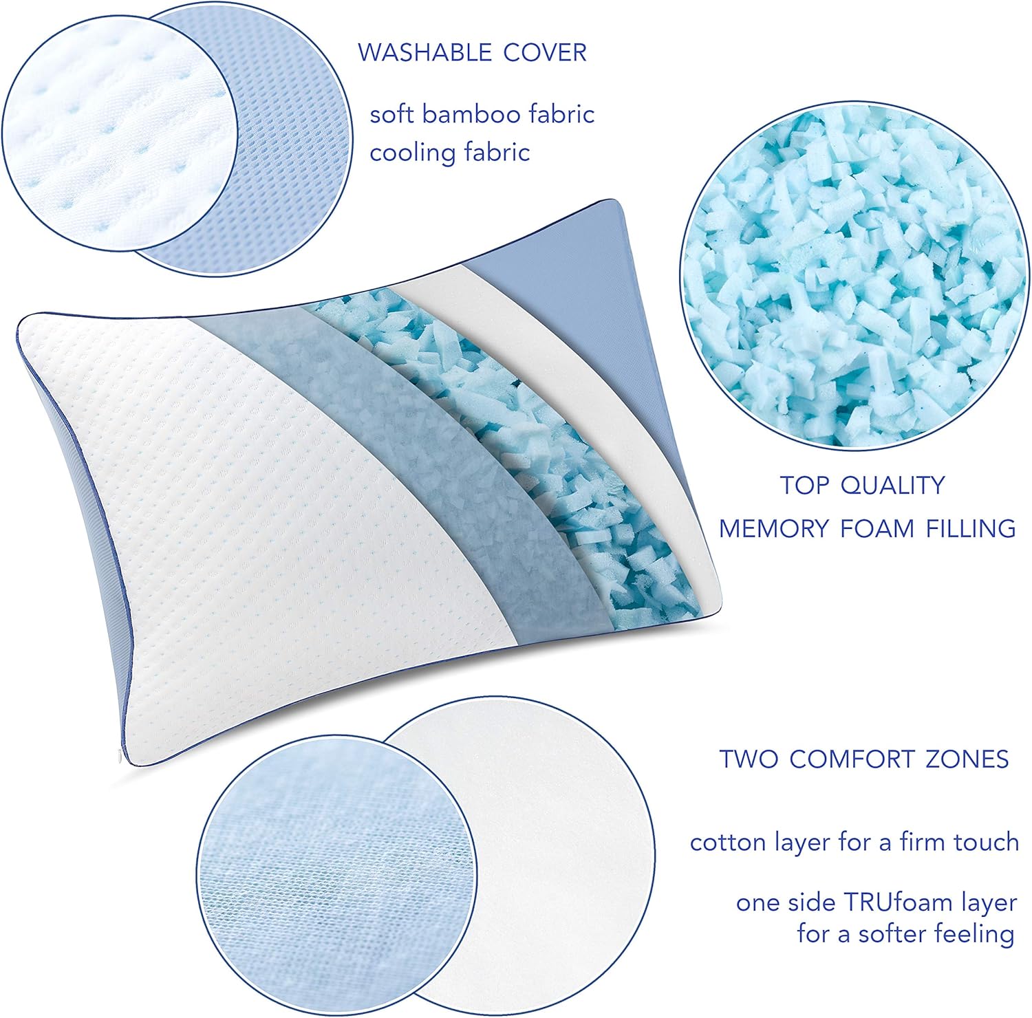 ❤️ START THE DAY FEELING AMAZING. Our memory foam pillow will come stuffed full of high quality blue gel memory foam that will provide personalized support to your head, neck and shoulders, relieving pain and enhancing your sleep. The 2 side Bamboo pillow case is luxury made from bamboo 40% and polyester air layer fabric 60%. This technology will allow the hot air to disperse easily, resulting in your head staying much cooler.