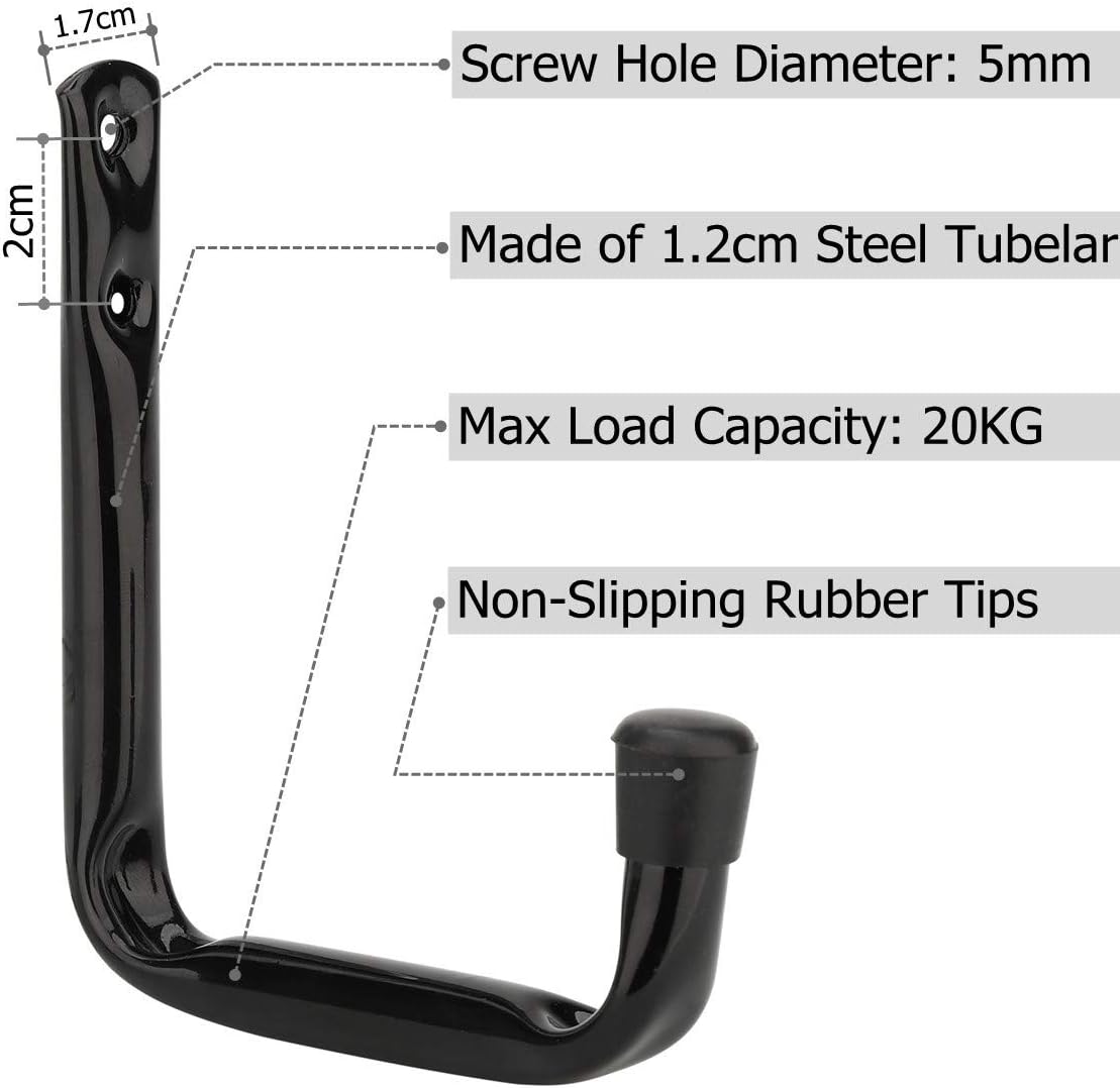 MATERIAL: Garage hanger are made of 1.6cm tubular steel , powder coated, glossy and rust resistant, the tip is wrapped with rubber, max load capacity 20KG.