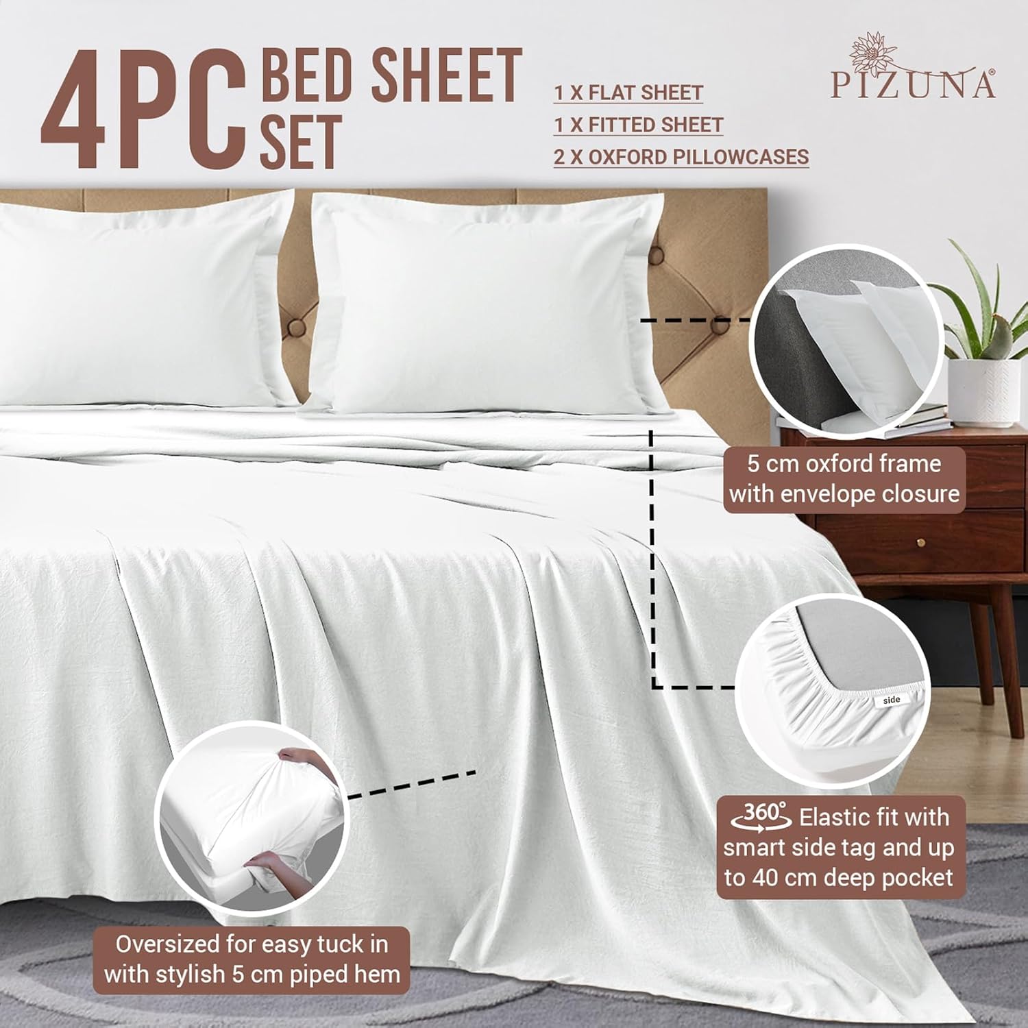Pizuna 100% Cotton Double Bed Sheet Set White, 400 Thead Count Long Staple Cotton Bedding Set 230×280 cm, Soft Sateen 4 PC Double Bed Sheet Set – Fitted Sheet, Flat Sheet & 2 Pillowcases