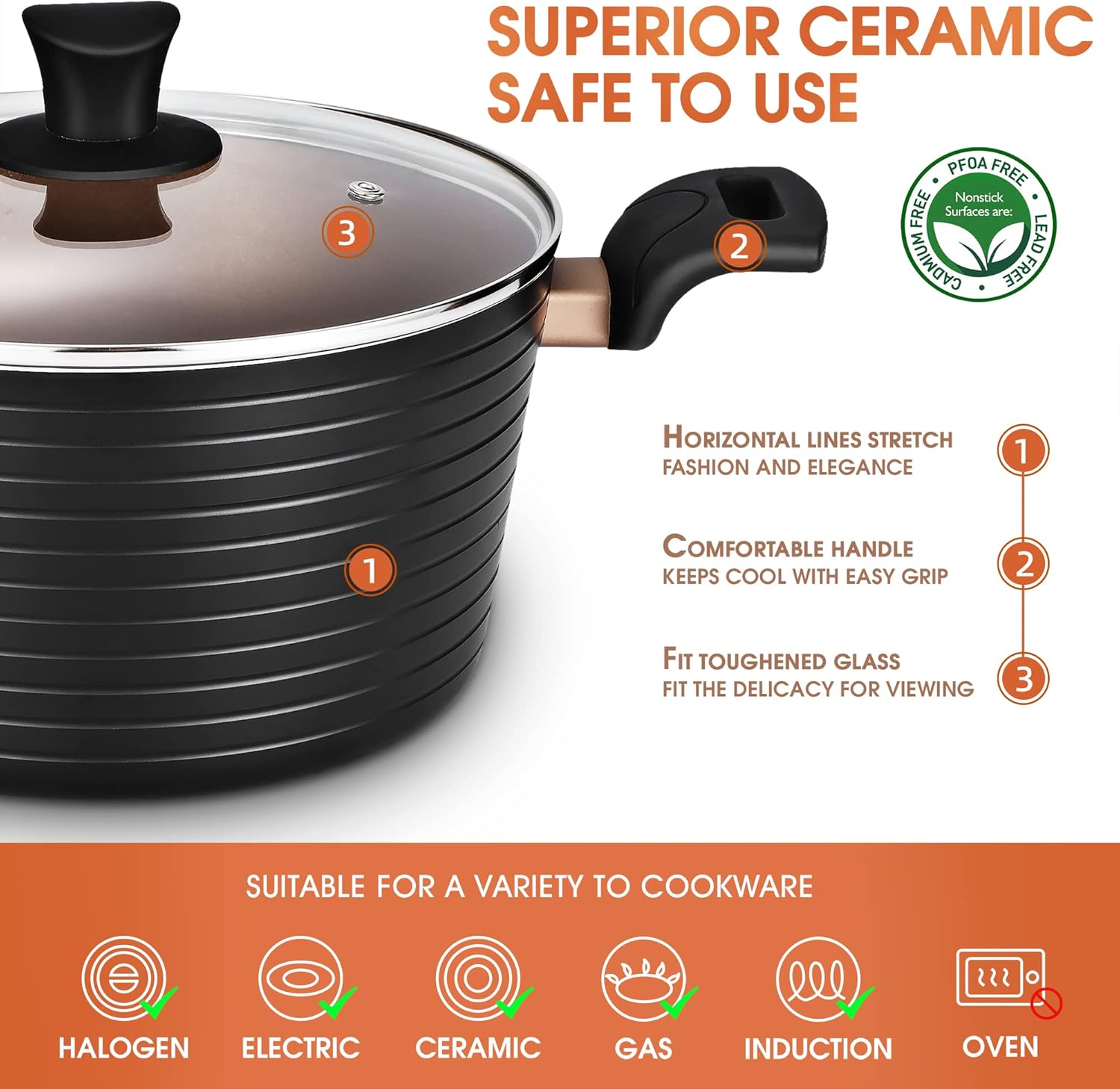 The nonstick cookware set is equipped with elegant black and delicate copper, great appearance for beauty your kitchen. With an elegant sleek metallic ridge-line pattern, the pan set adds a stylish and modern. We mainly produce frying pans, sauce pans, stock pots, etc., multi-size pots and utensils for different cooking purposes to meet your daily cooking. Perfect pots and pans set for every family.