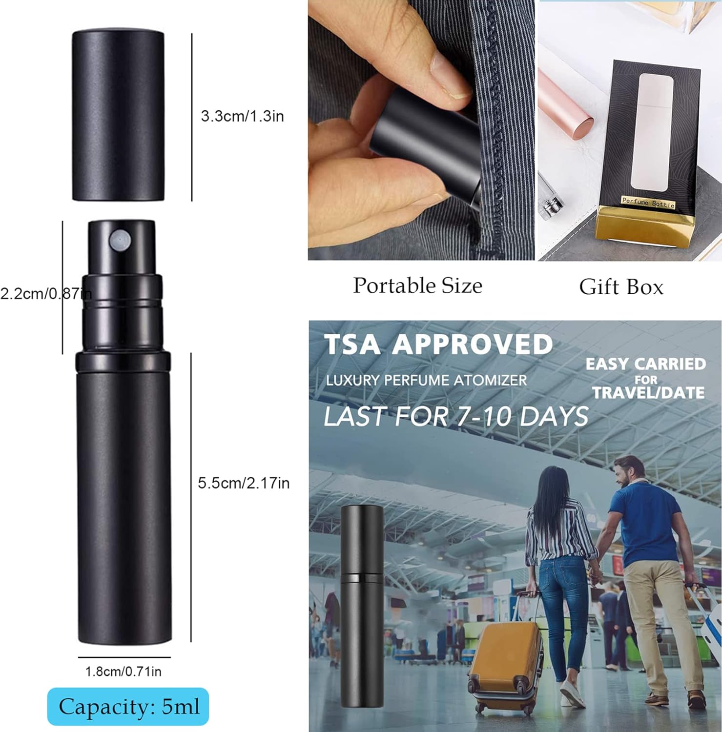 SIMPLE AND CONVENIENT — This perfume atomizer bottle is conveient to use and easy to fill/refill, just press the bottom against your favorite perfume gauge and keep clicking until it is refilled. It can last for 7-10 days when filled up, you don’t need to carry a whole bottle of perfume.