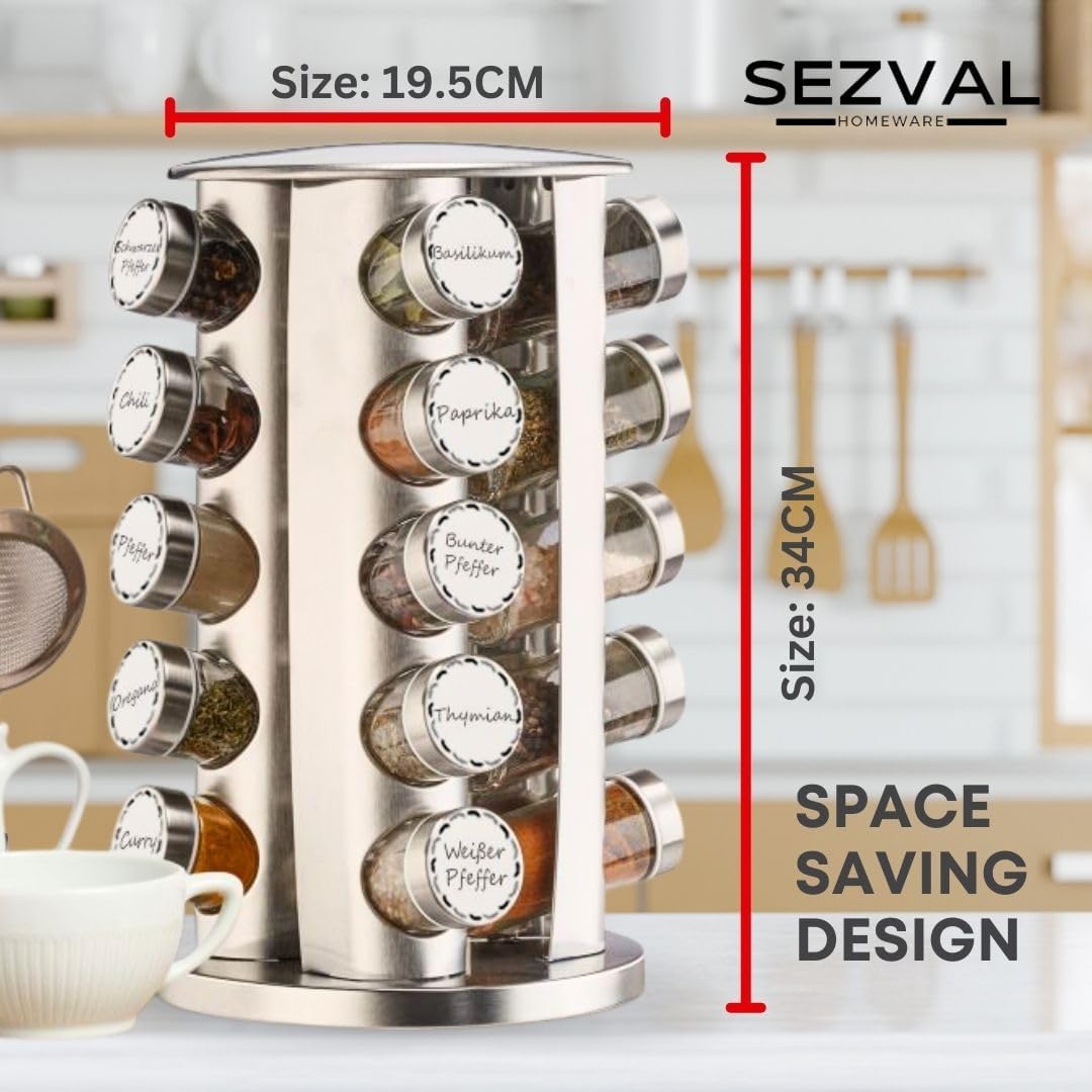 Premium 304 stainless steel construction for durability and rust-resistance.20 spice jars with optimal sealing to keep your herbs and seasonings fresh.Customize your spice labels with the included erasable labels and liquid chalk.Space-saving tower-style design that maximizes your countertop space.