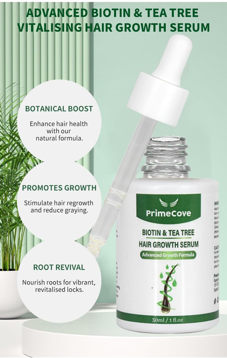 PrimeCove – Biotin & Tea Tree Hair Growth Serum (30ml) | Stimulate Growth, Reduce Graying & Nourish Roots | Advanced & Natural Formula