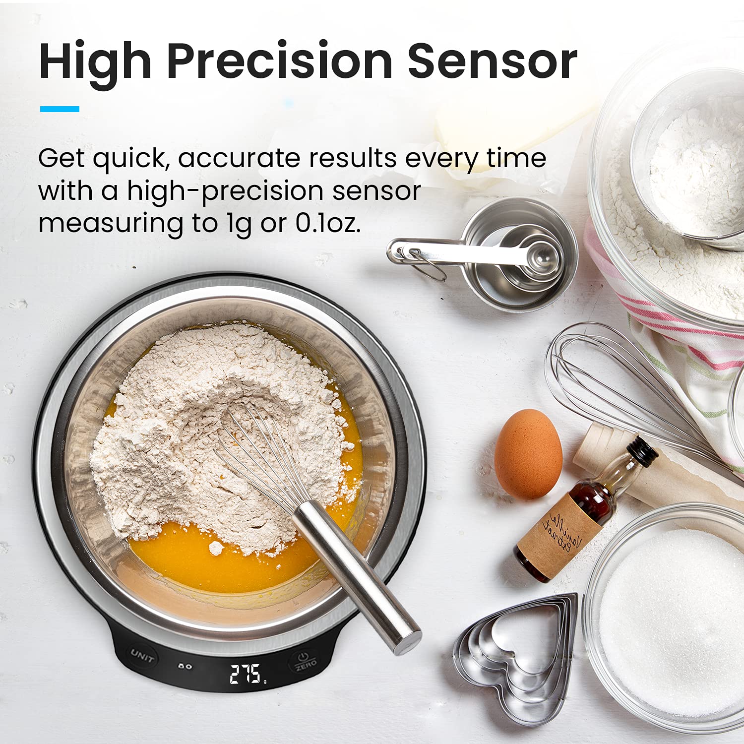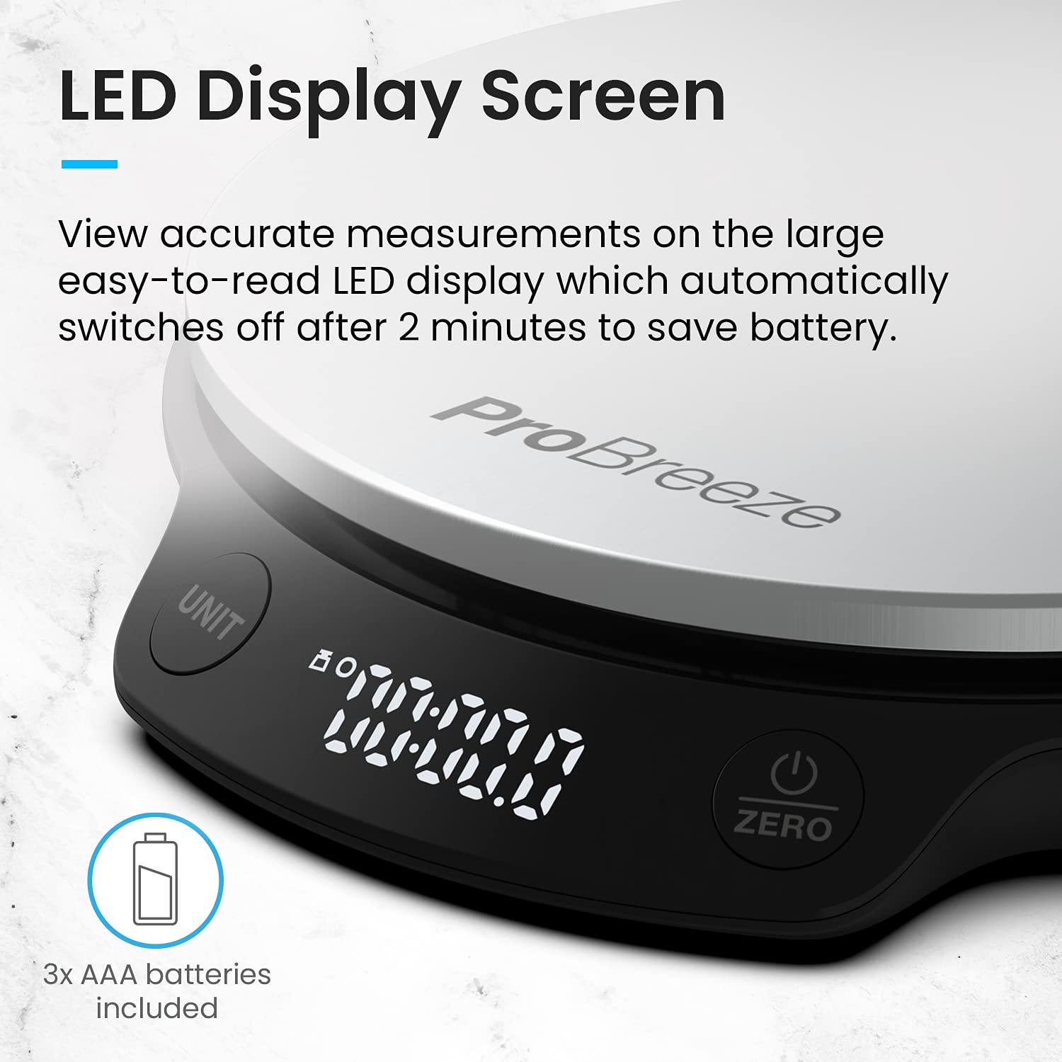 Accurate Measurements: The Pro Breeze Food Scale lets you measure solids or liquids accurately in g, ml, lb oz or fl oz. With our food scales for kitchen, you can measure to a precision of 1g or 0.1oz of a weight up to 5kg or 11lbs.