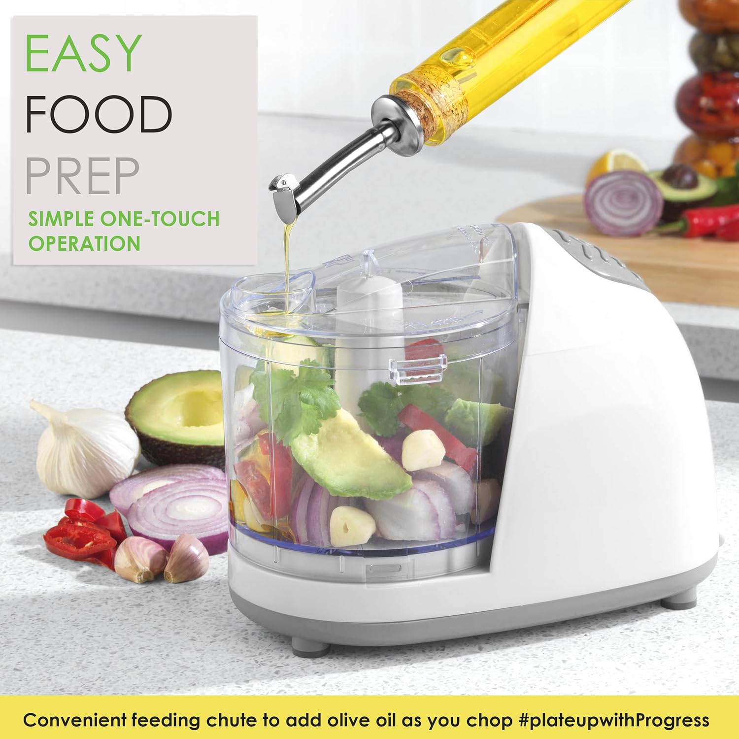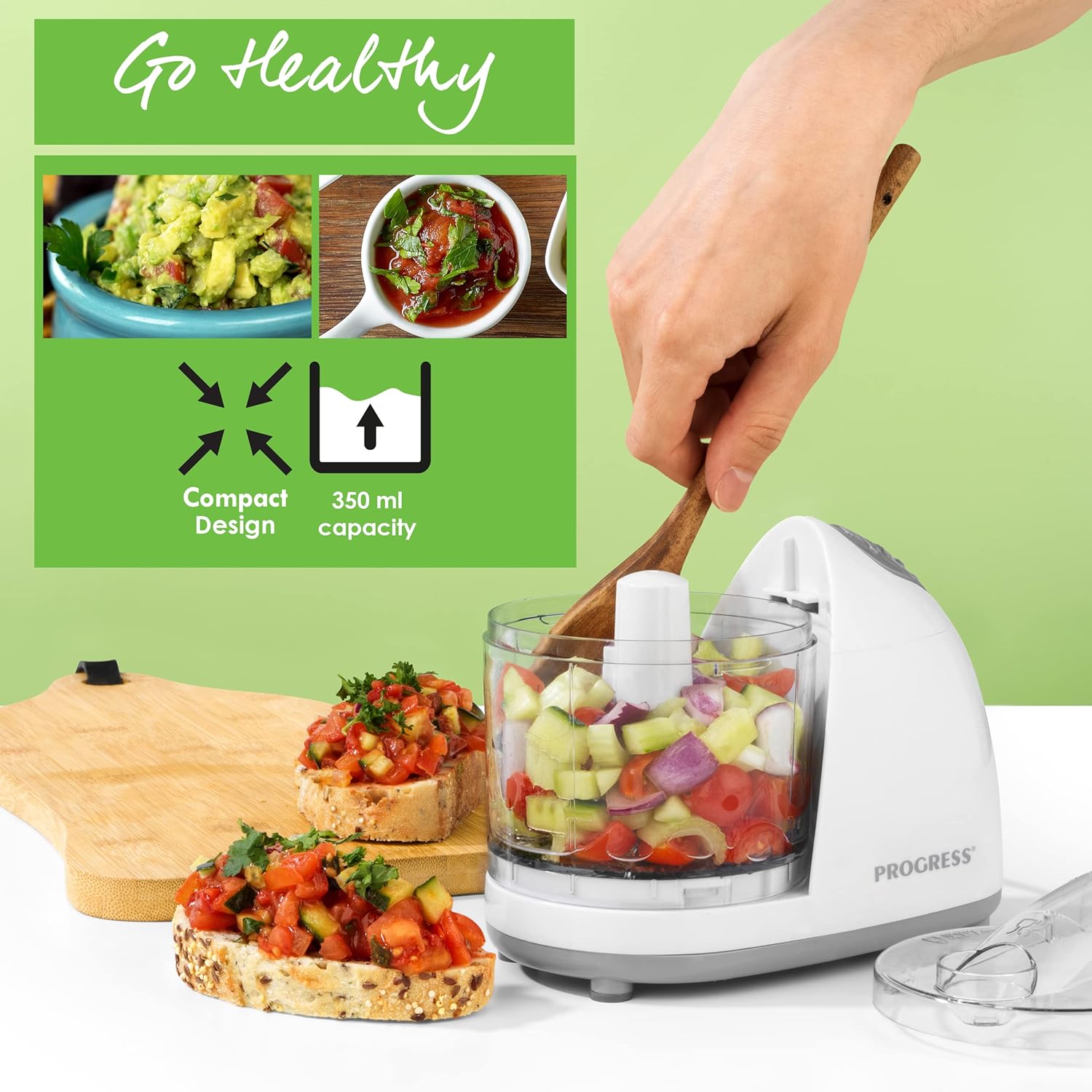 Progress EK2182P Go Healthy Mini Food Chopper – Small Electric Food Processor, Compact Vegetable Blender, 350 ml Chopping Bowl, One Touch Operation, Stainless Steel Blades, Oil Feeding Chute, 150W