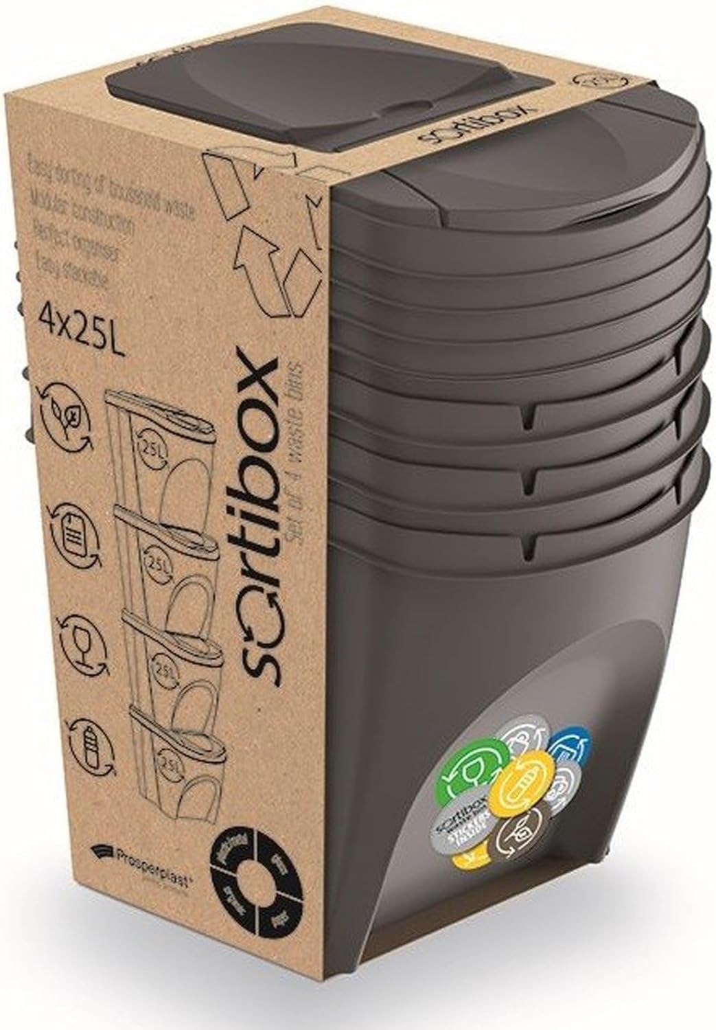 Prosperplast KEDEN Sortibox Set of 4 Recycling Bins, Grey, Volume 4 x 25L