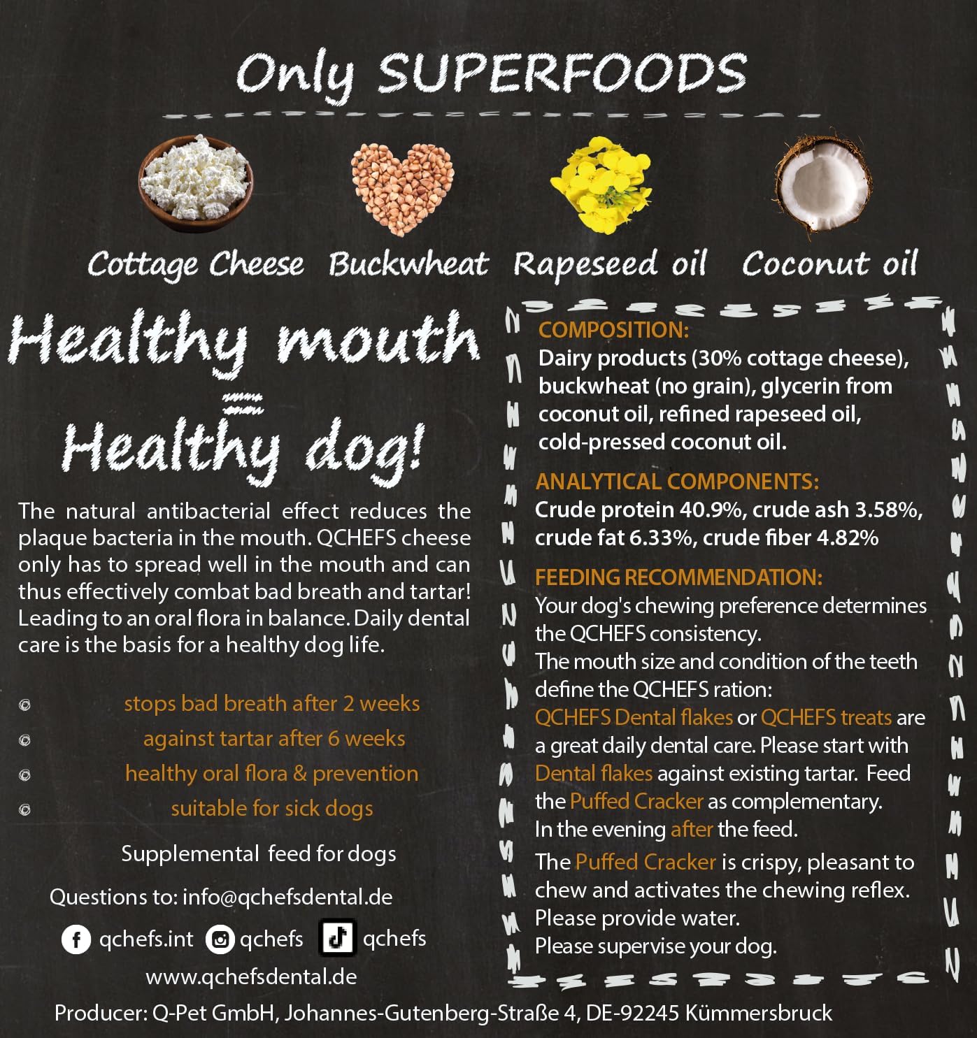 Mouth healthy = Dog healthy! The naturally antibacterial effect reduces plaque bacteria in the mouth. QCHEFS Cheese only needs to distribute well in the mouth and can be effective against bad breath and tartar! Daily dental care is the basis for a healthy Dog Life.