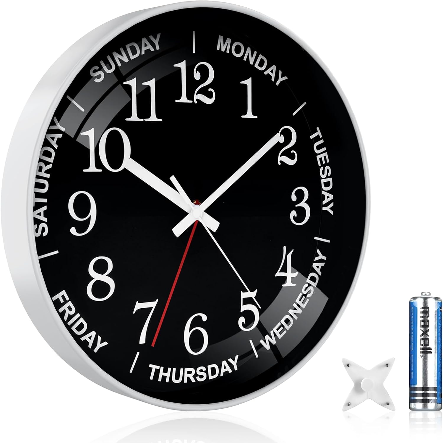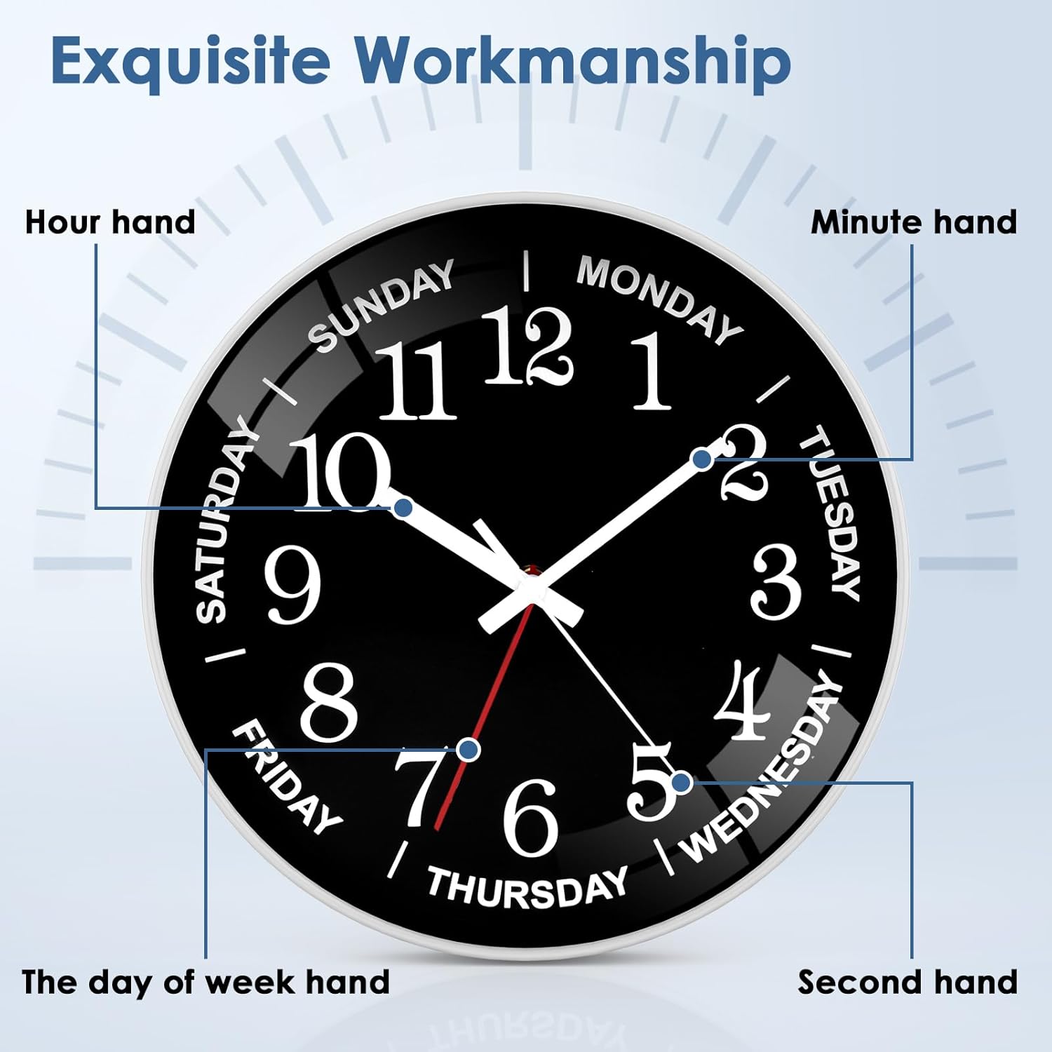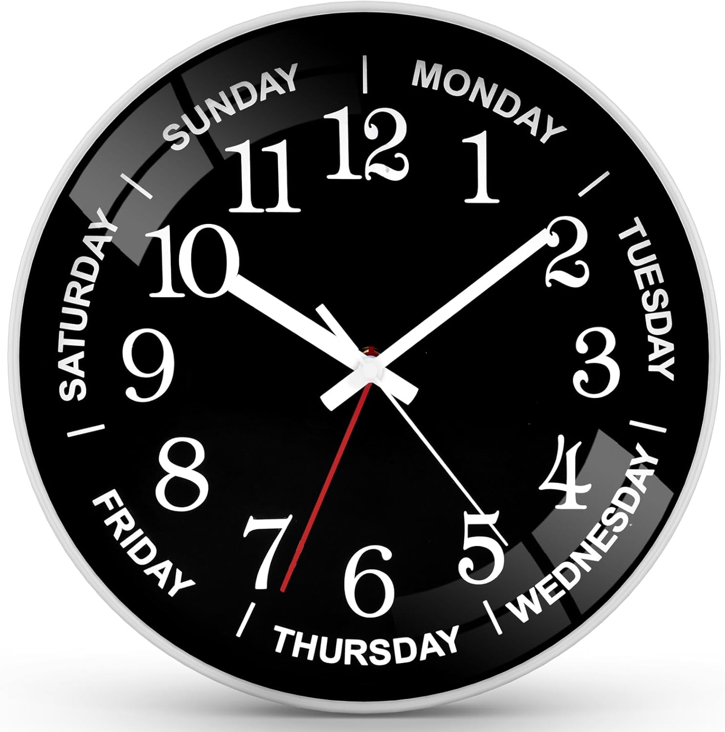 QINFIEY 12 Inch Day of Week Wall Clock, Non Ticking Modern Clocks Battery Operated,Analog Day Clock for Seniors Eldly,Classic for Office Home Classroom Bedroom School,Unique Gift Clock