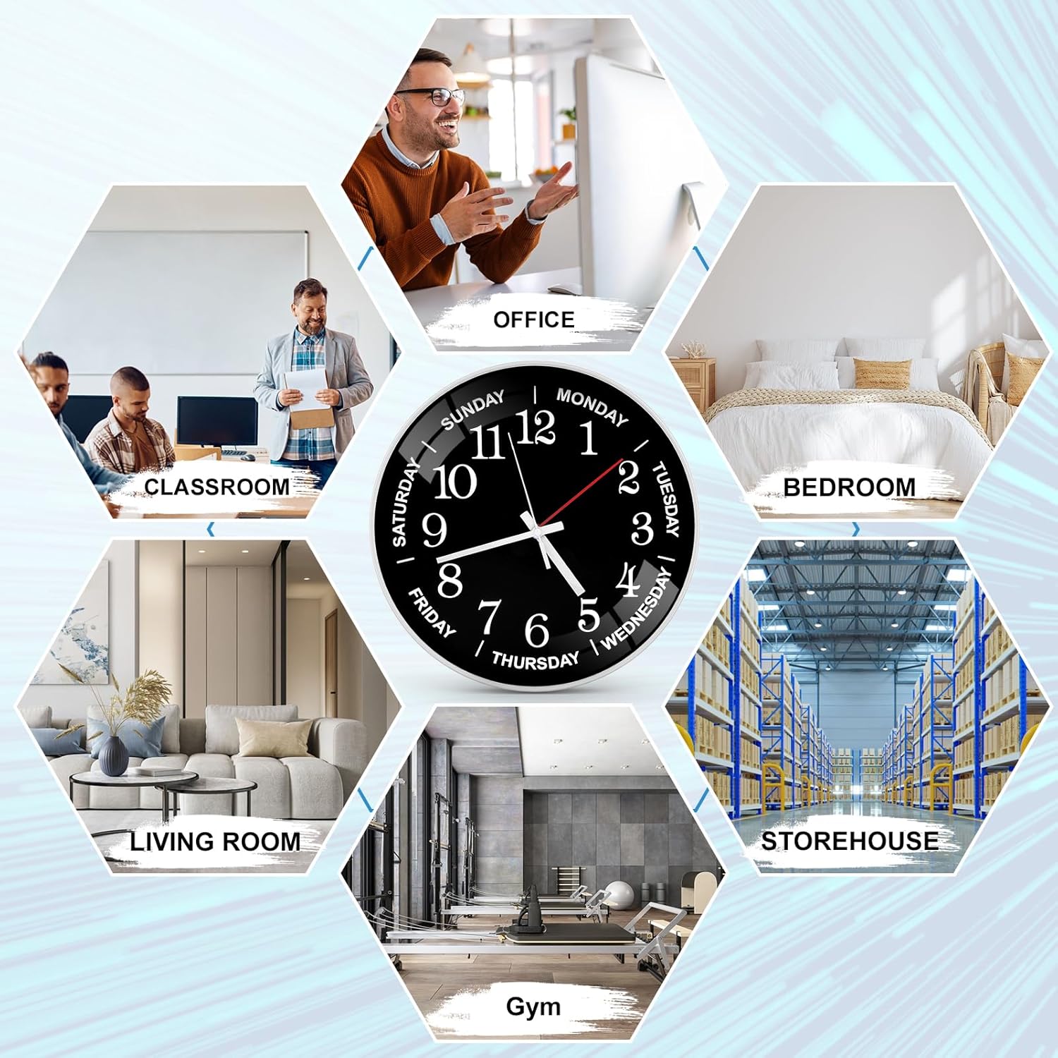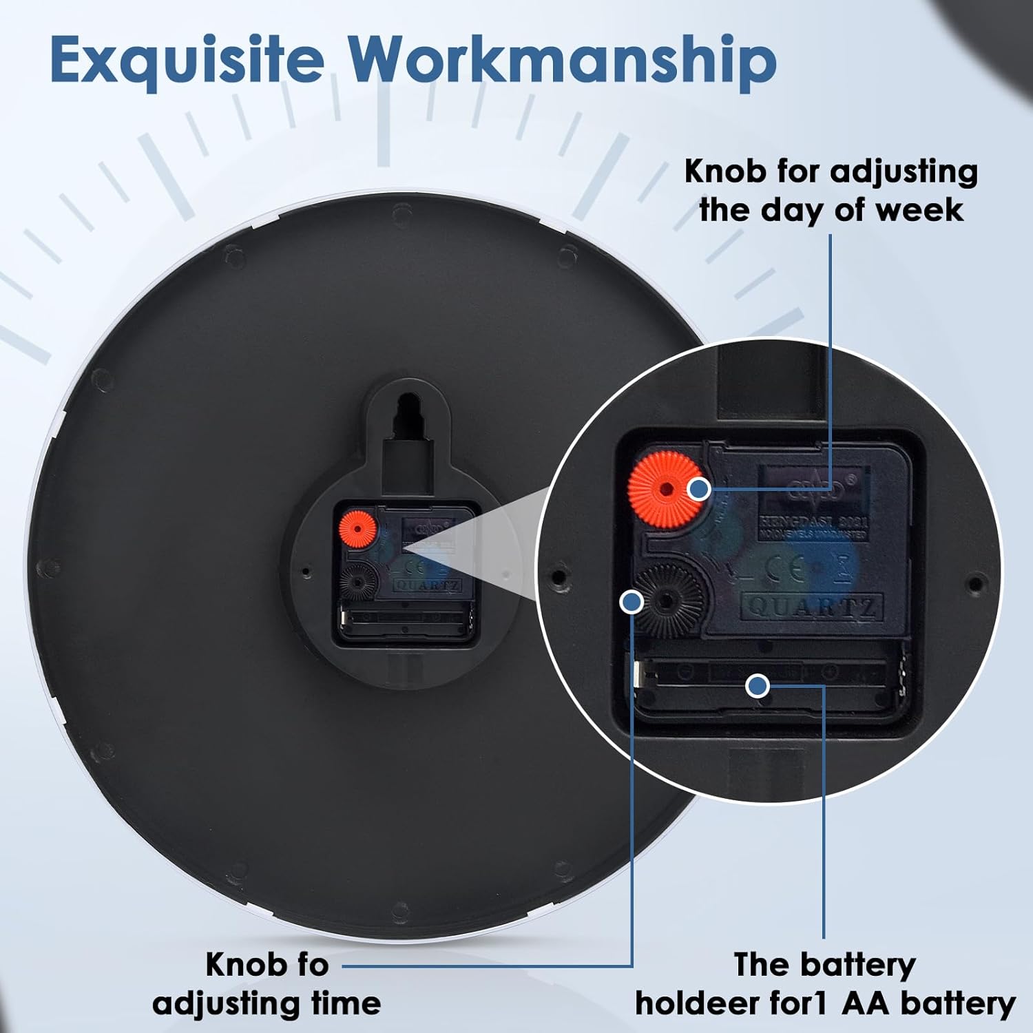 【Easy to read and use】: large white numbers and eye-catching hands for quick identification of the time and day of the week, a hanging hole on the back (package includes 1 non-trace hook) for easy hanging, and a battery-powered clock(package includes 1 AA battery) does not require assembly.