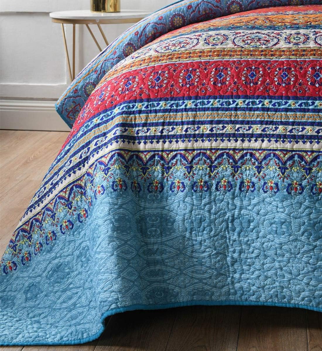Qucover Single Bedspread Quilted Lightweight Soft Bohemian Quilted Throw Blanket 150 x 200 cm, Vibrant Red Blue Boho Throw