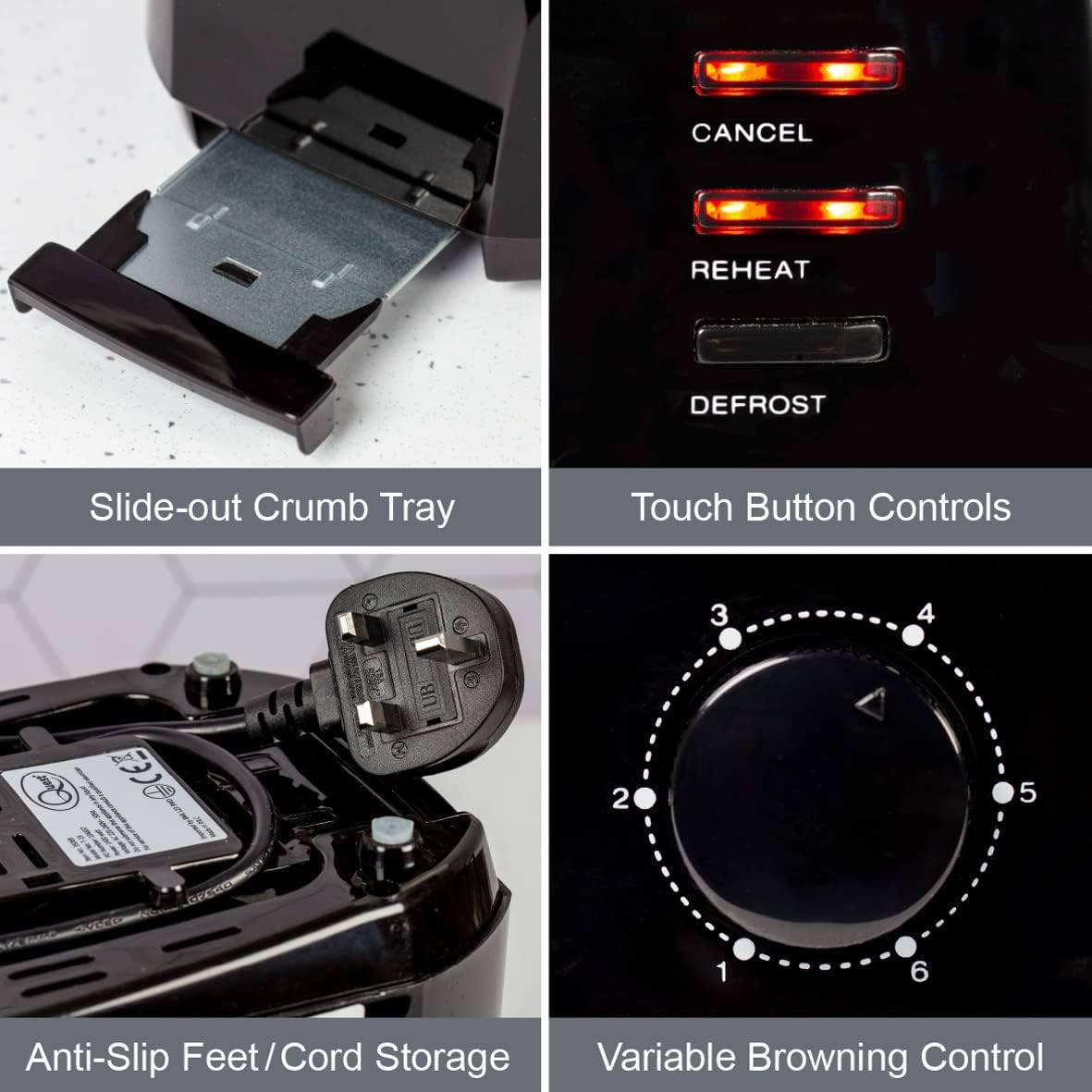 REHEAT AND DEFROST OPTION – The reheat function means that you can easily warm up toast that has cooled down, perfect for those times when you are busy and miss the toast popping up. The defrost button allows you to toast bread straight from the freezer without the need to leave it defrosting for hours.