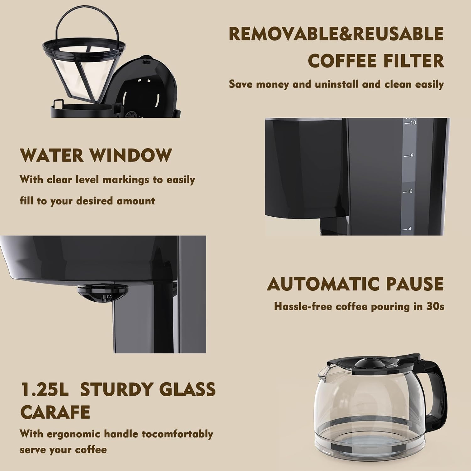 RAINBEAN Filter Coffee Machine, Drip Coffee Maker with 1.25L Glass Coffee Jug & hot plate, Auto Pause, Reusable Filter, Keep Warm Functions, 800W, Black