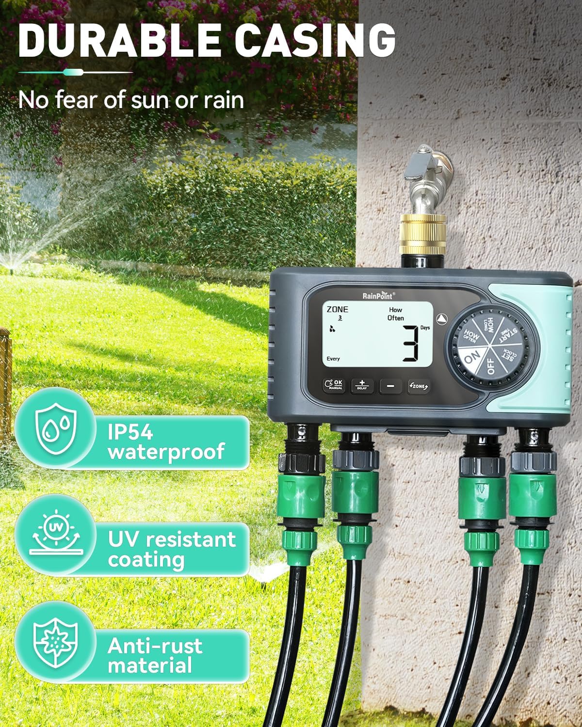 【100% Brass Water Inlet】: The RAINPOINT water timer has a pure brass water inlet that reduces wear on the timer threads compared to plastic inlets. It can withstand higher water pressure and is more robust and durable.