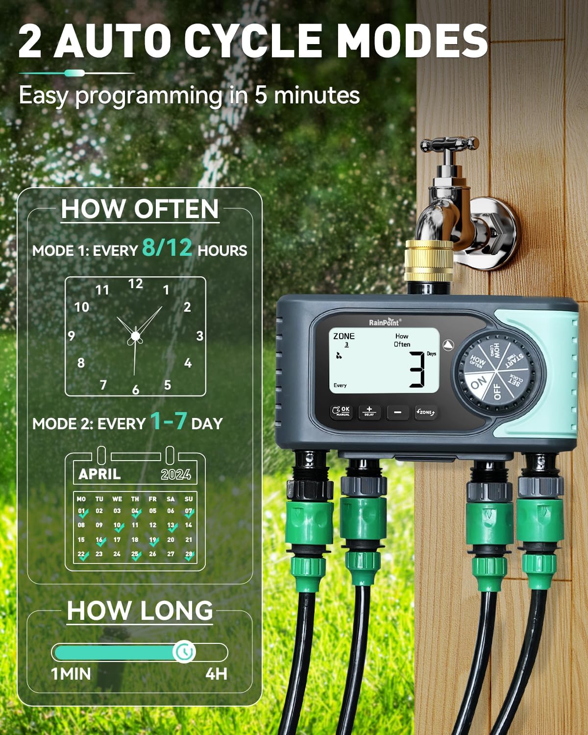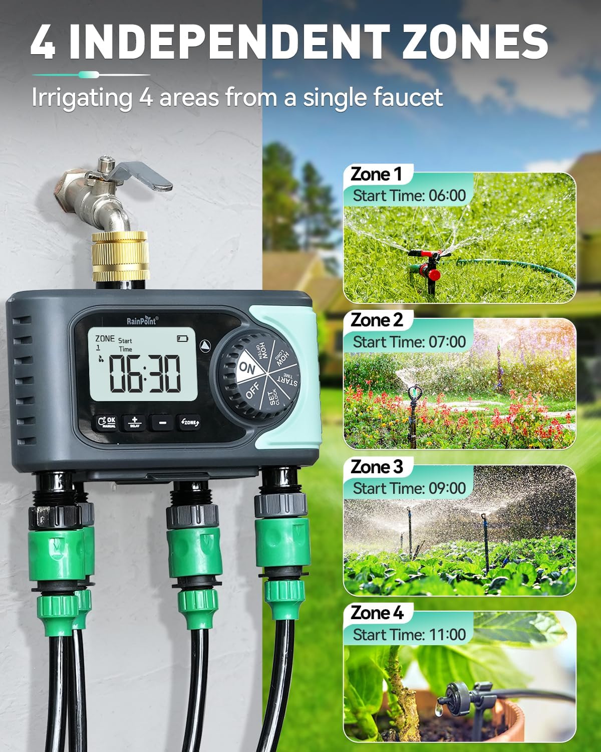 【4 Independent Zones】: RAINPOINT irrigation timer features 4 independent outlets, watering four different areas through one faucet. Each zone can be set with different start times, durations (1 minute to 3 hours 59 minutes), and frequencies (every 8/12 hours or 1-7 days). Helps you easily control and manage watering for your garden, yard, and lawns.