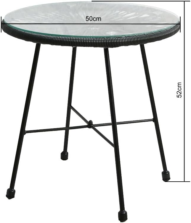 Stable and strong steel frame – Table with removable safety glass top – Plastic caps to protect your floors – Elastic rattan strands
