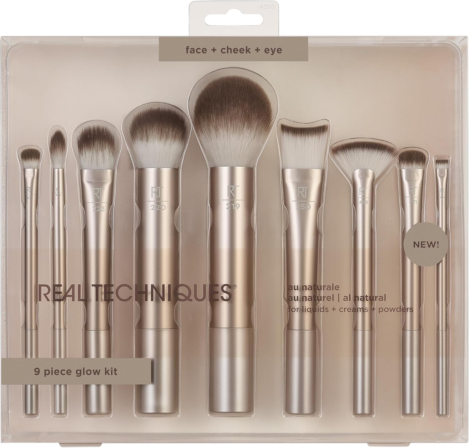 REAL TECHNIQUES Au Naturale Makeup Brush Kit, For Foundation, Powders, and Concealers, Premium Quality Face Brushes, 9 Piece Set, Gold