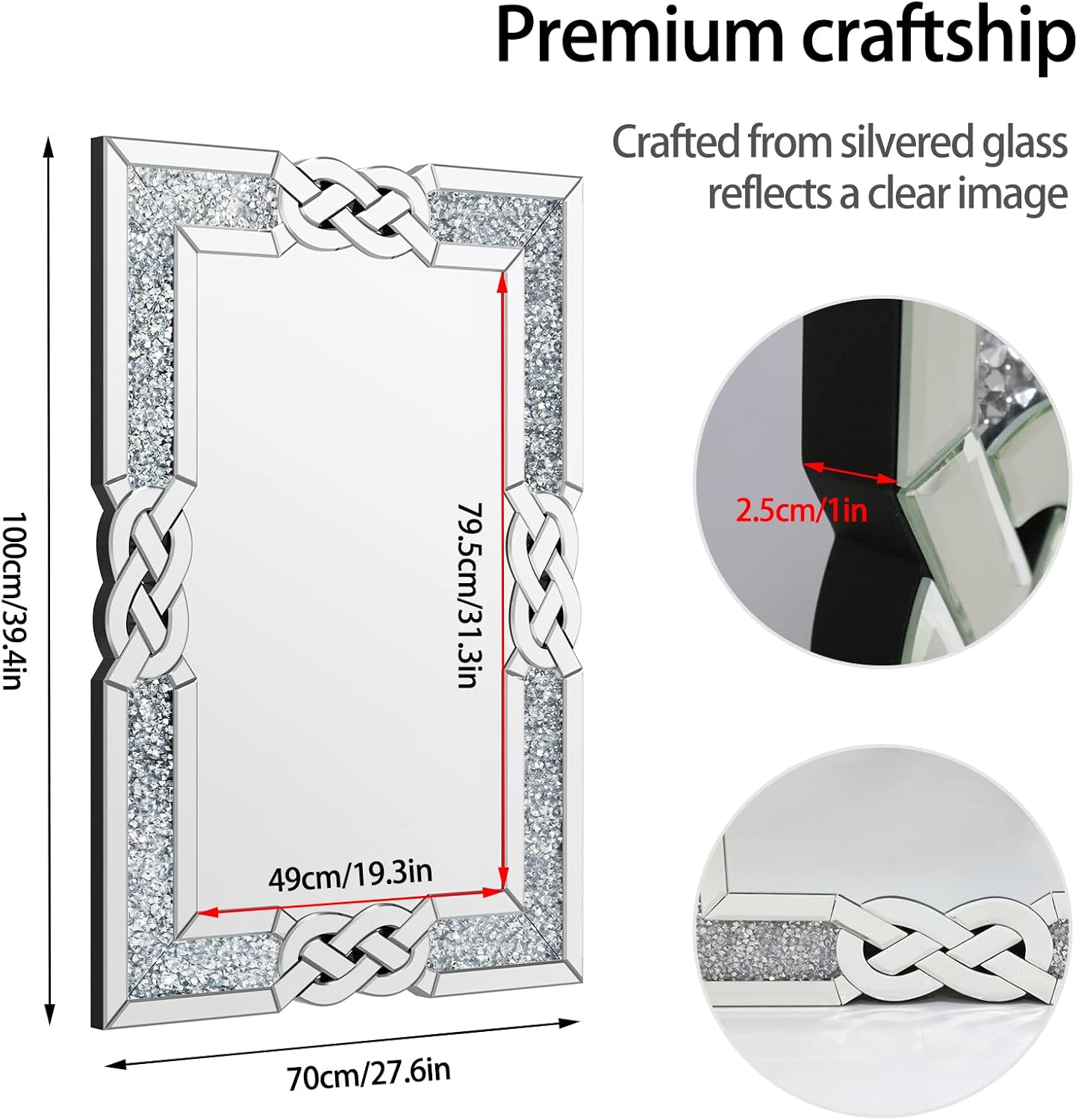 Material 50%MDF+50%Glass Color Silver Thickness 2.5cm Medium Product Dimension L * H 90x60cm , Net Weight: 11.83kg Large Product Dimension L * H 100x70cm , Net Weight: 14.8kg Package Includes 1 x Wall Art Mirror ,1 x Instruction