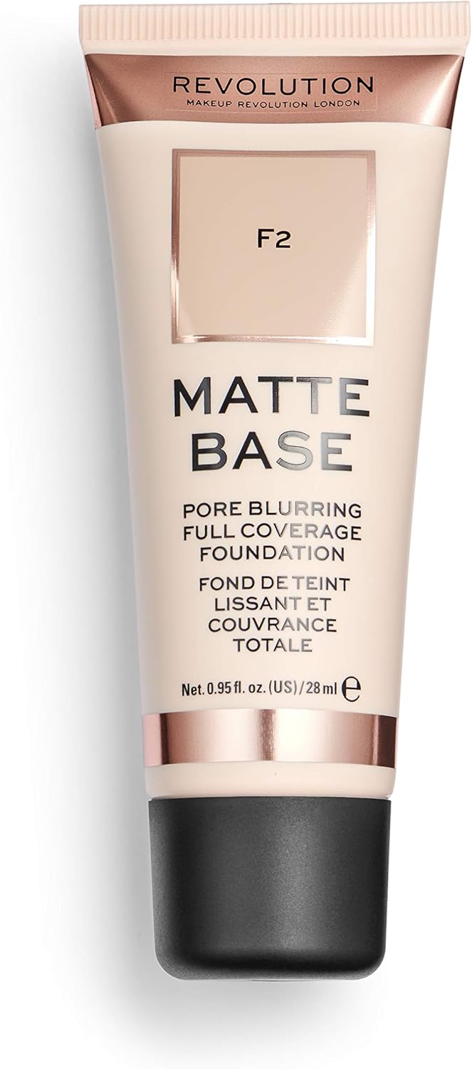 Revolution Matte Base Foundation F2.A mattifying solution for oily, blemish-prone complexions.A full-coverage foundation boasts a long-wearing, matte finish.Lightweight and comfortable on the skin.Diffusing the appearances of pores for a blurred, airbrush-like finish